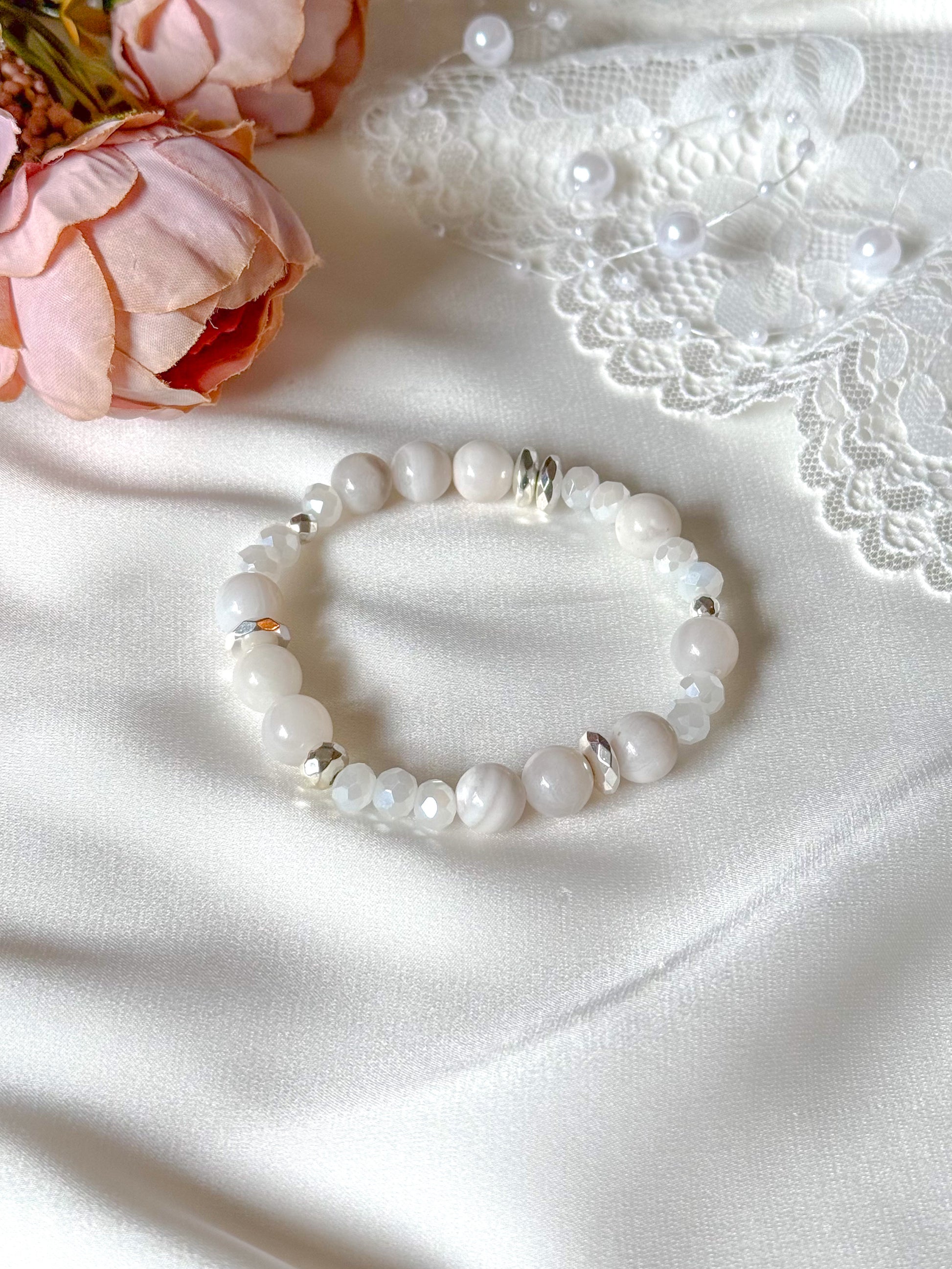 Delicately woven with 6 mm white glass beads and bold 8 mm Crazy Lace Agate, the Whispering Lace Bracelet is a harmonious blend of softness and vibrant energy. Crazy Lace Agate, known as the “Laughter Stone,” uplifts the spirit and encourages joy, while the white glass beads add a touch of purity and balance. Together, they create a bracelet that inspires positivity, clarity, and emotional strength. Wear Whispering Lace as your daily reminder to find beauty in life’s patterns and to embrace every moment with lightness and grace.