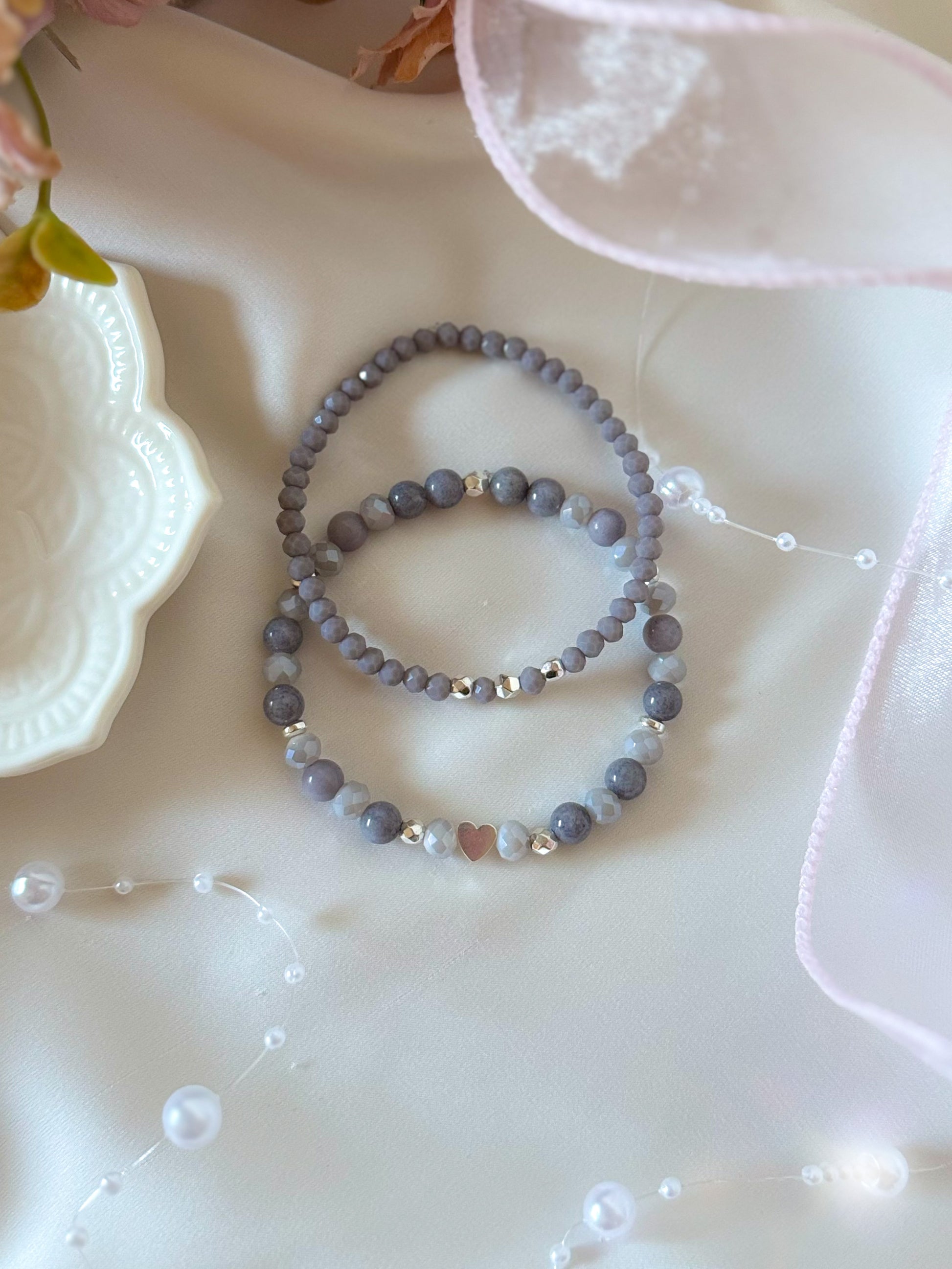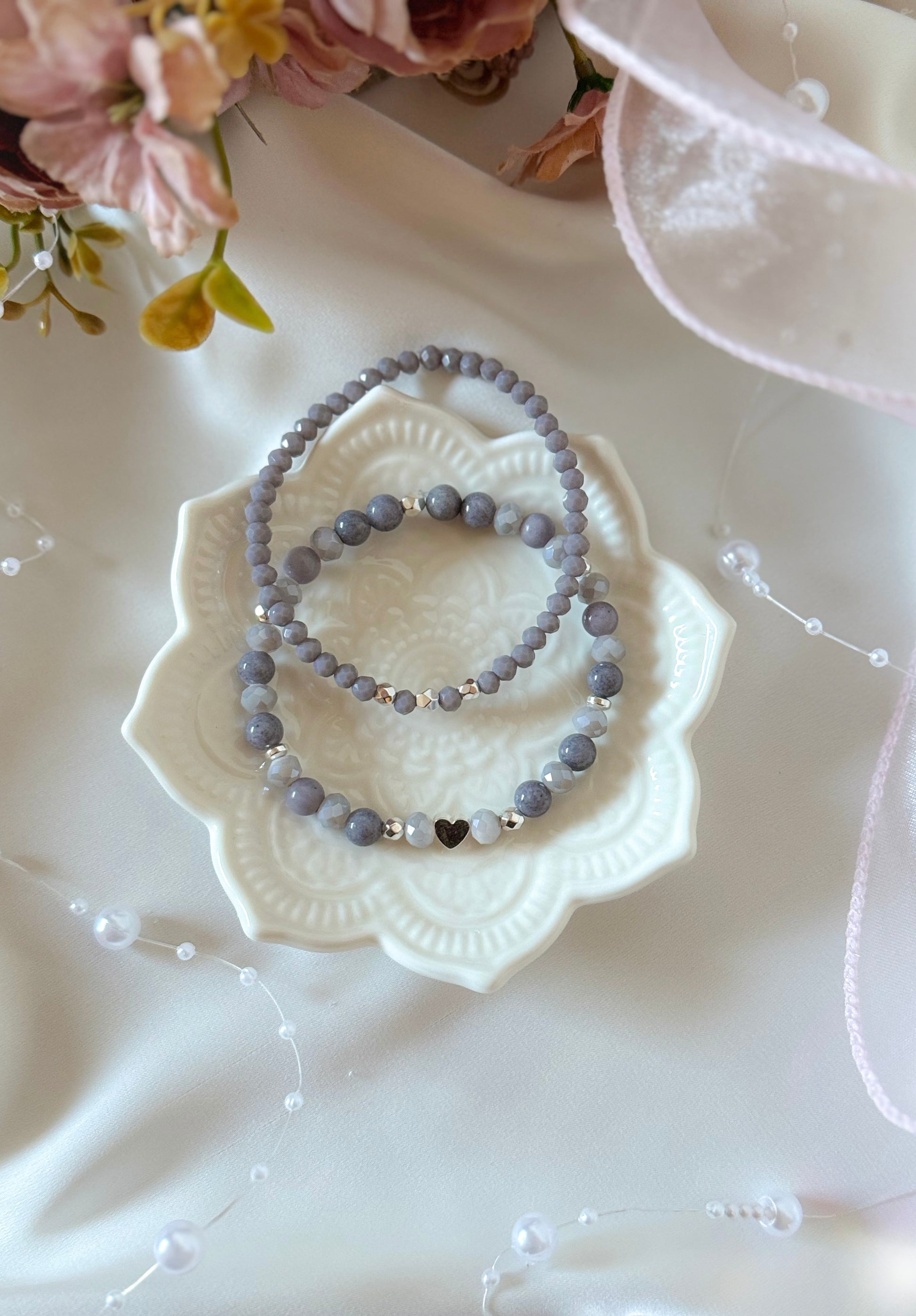Find balance and tranquility with the Winter Harmony Set, featuring two beautifully complementary bracelets crafted from cool grey 6mm Agate and grey shimmery 4mm glass beads.