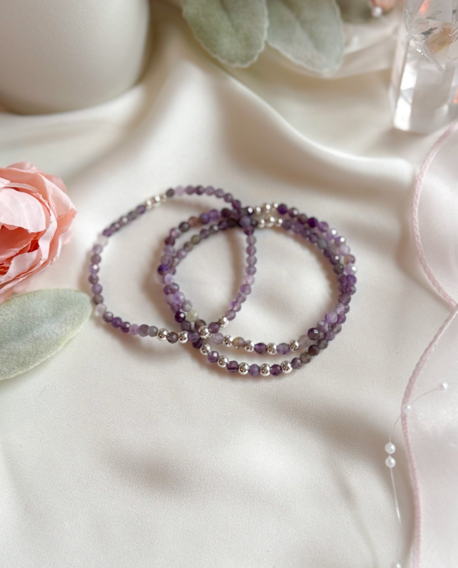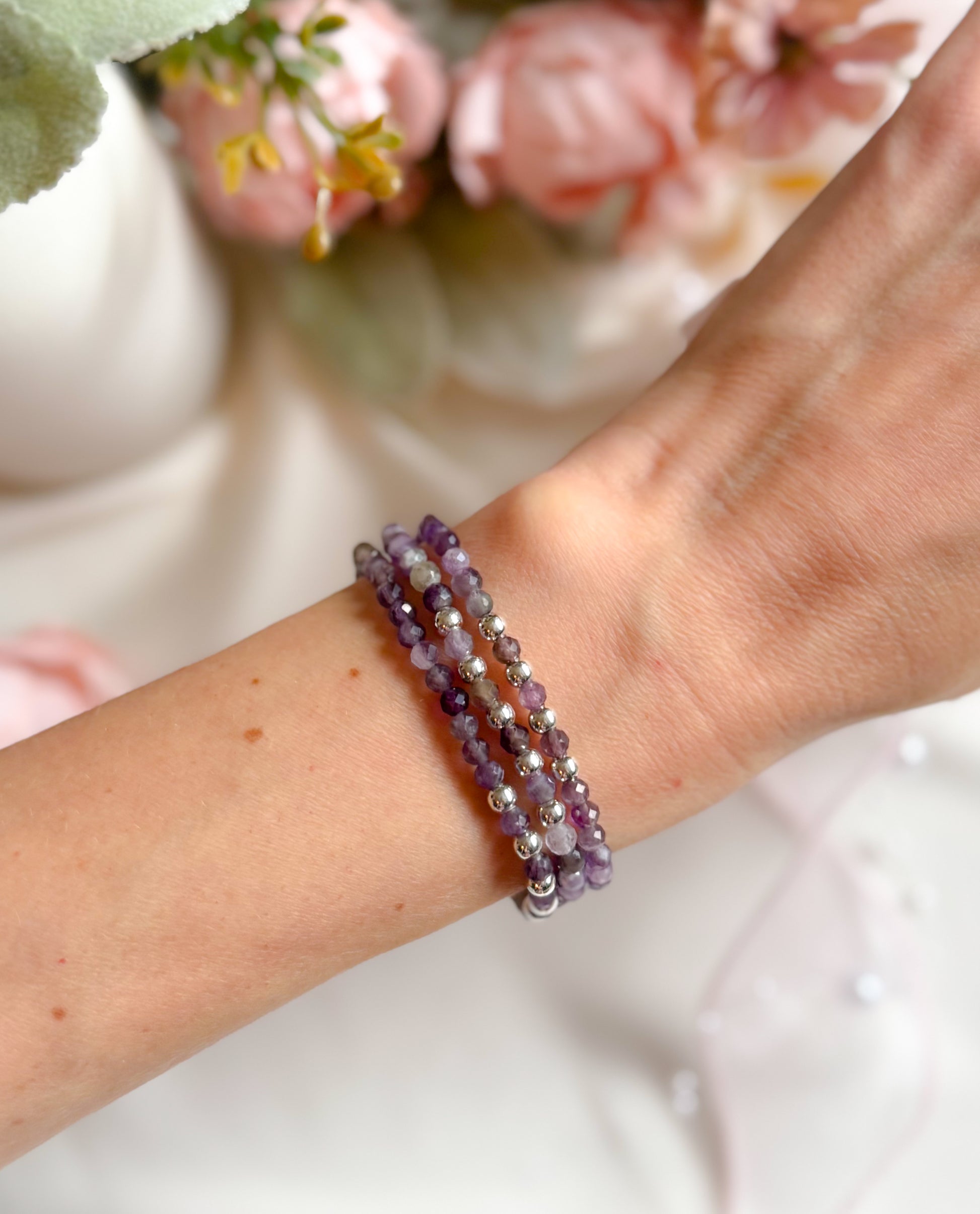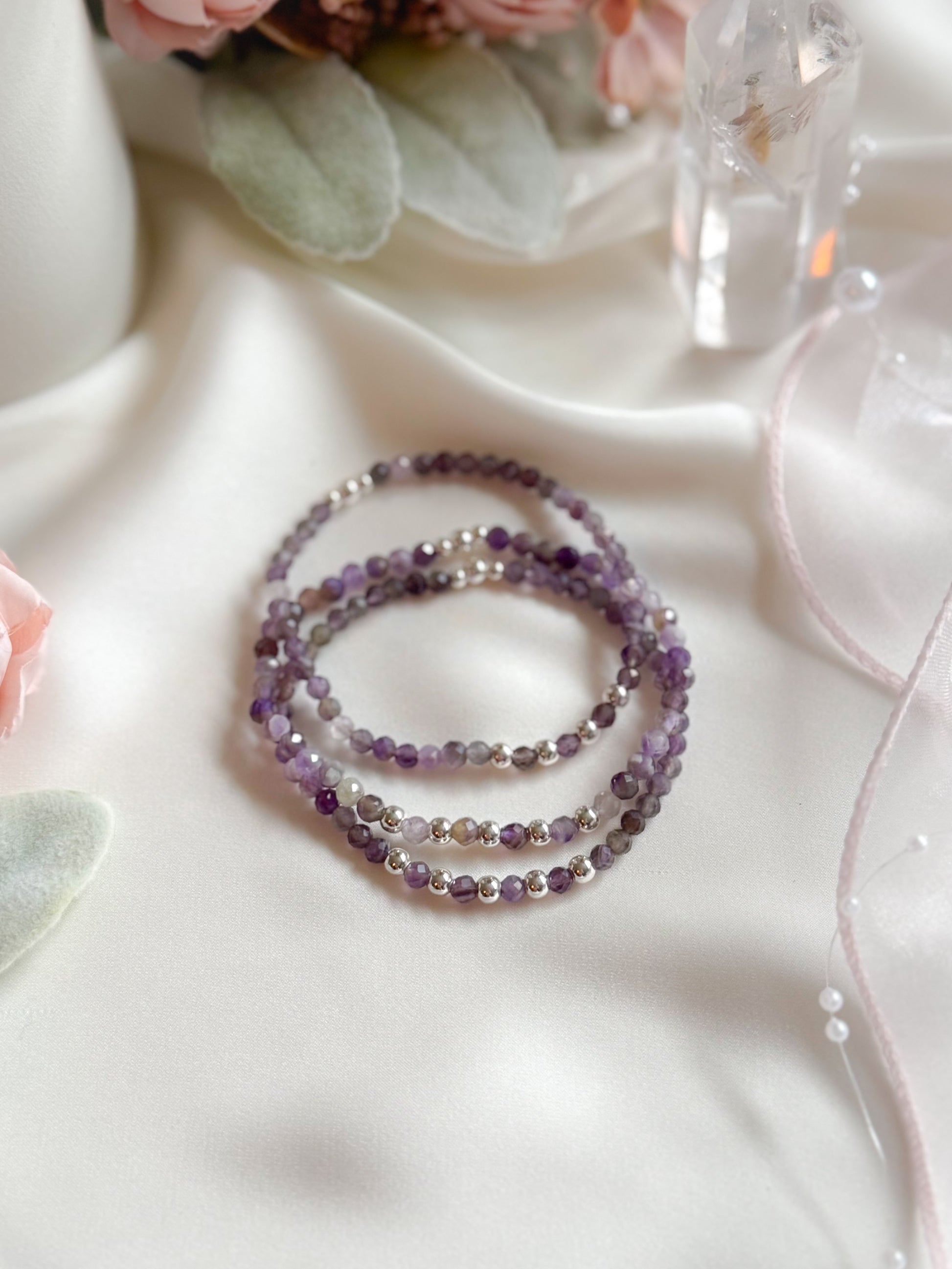 • Faceted Amethyst (4mm): Promote relaxation, reduce stress, enhance spiritual awareness, and support emotional balance.