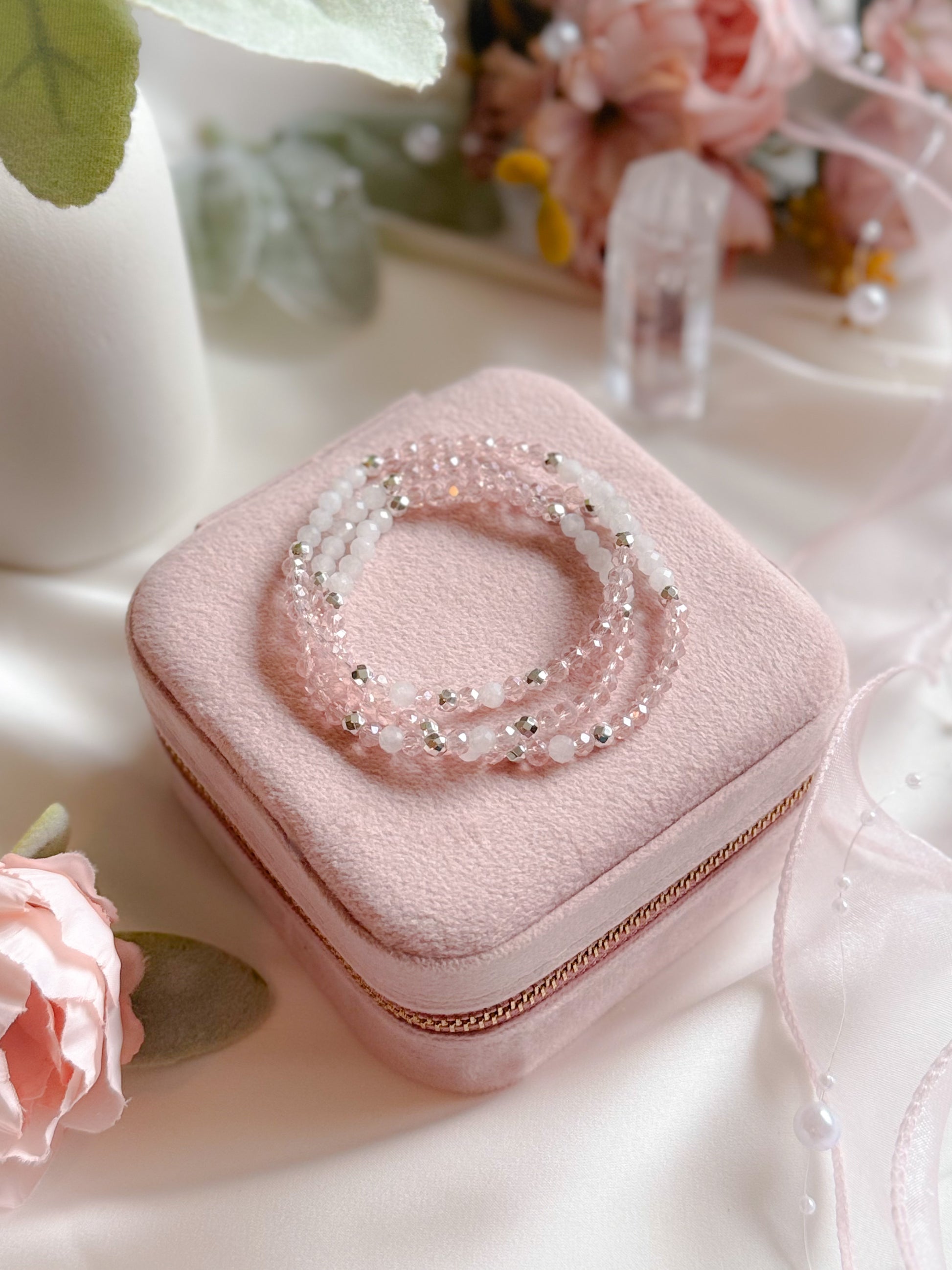 • The soft blush and luminous moonstone tones feel feminine, calming, and timeless