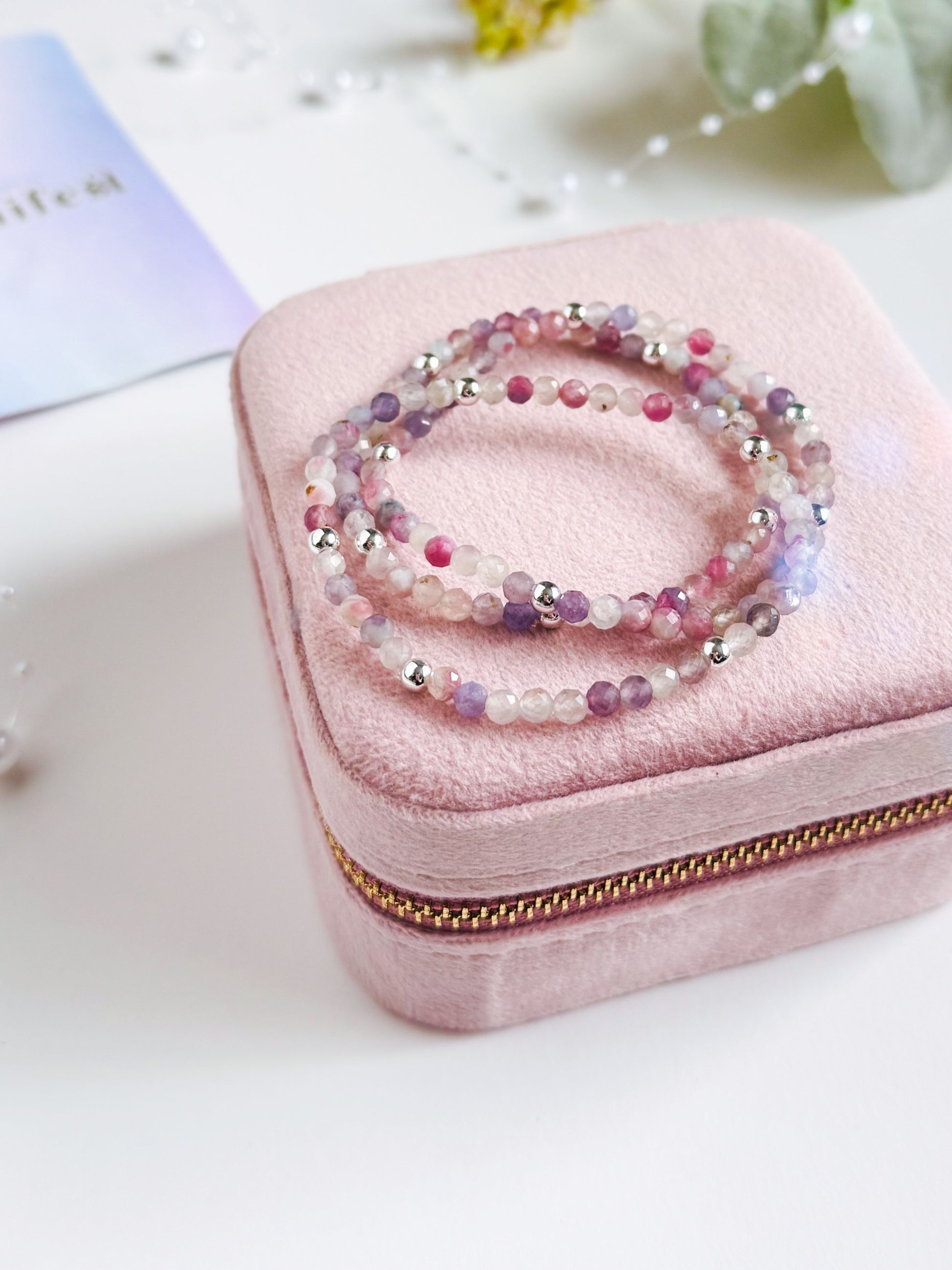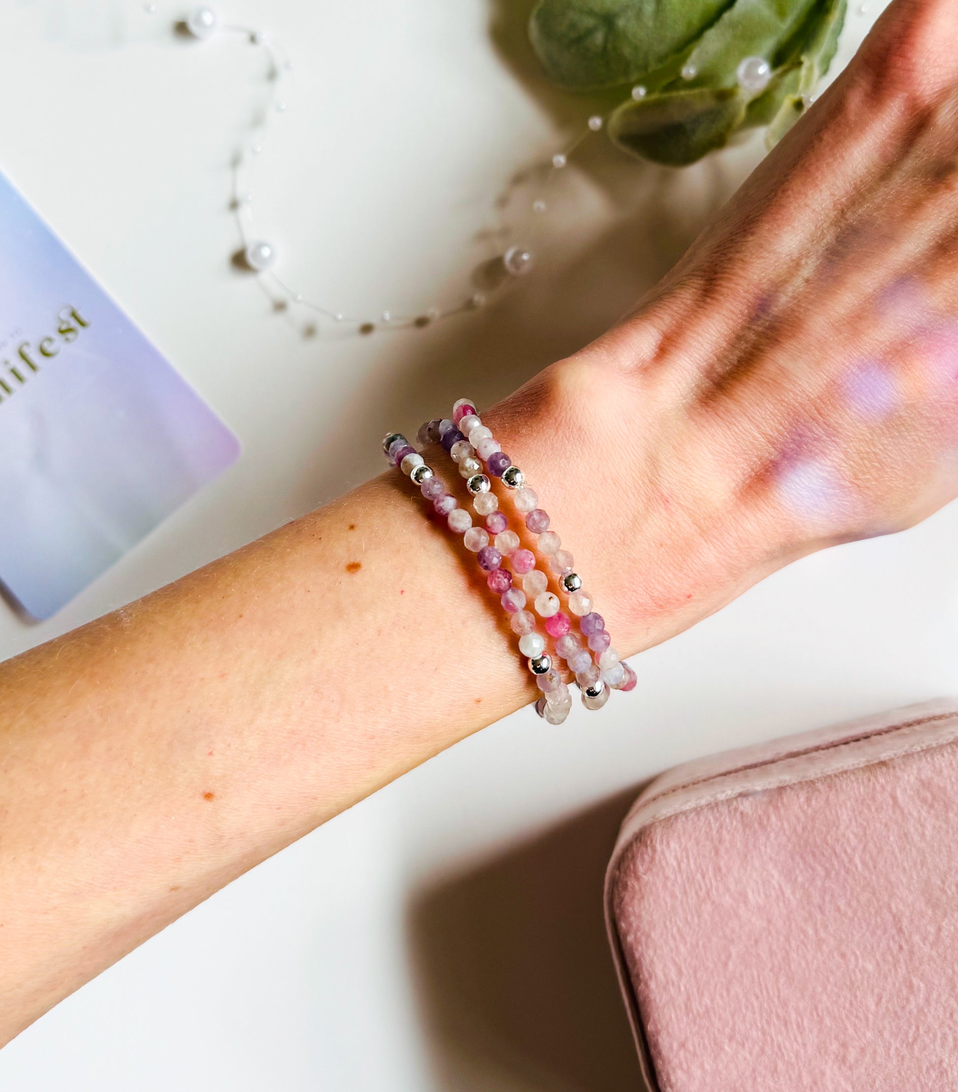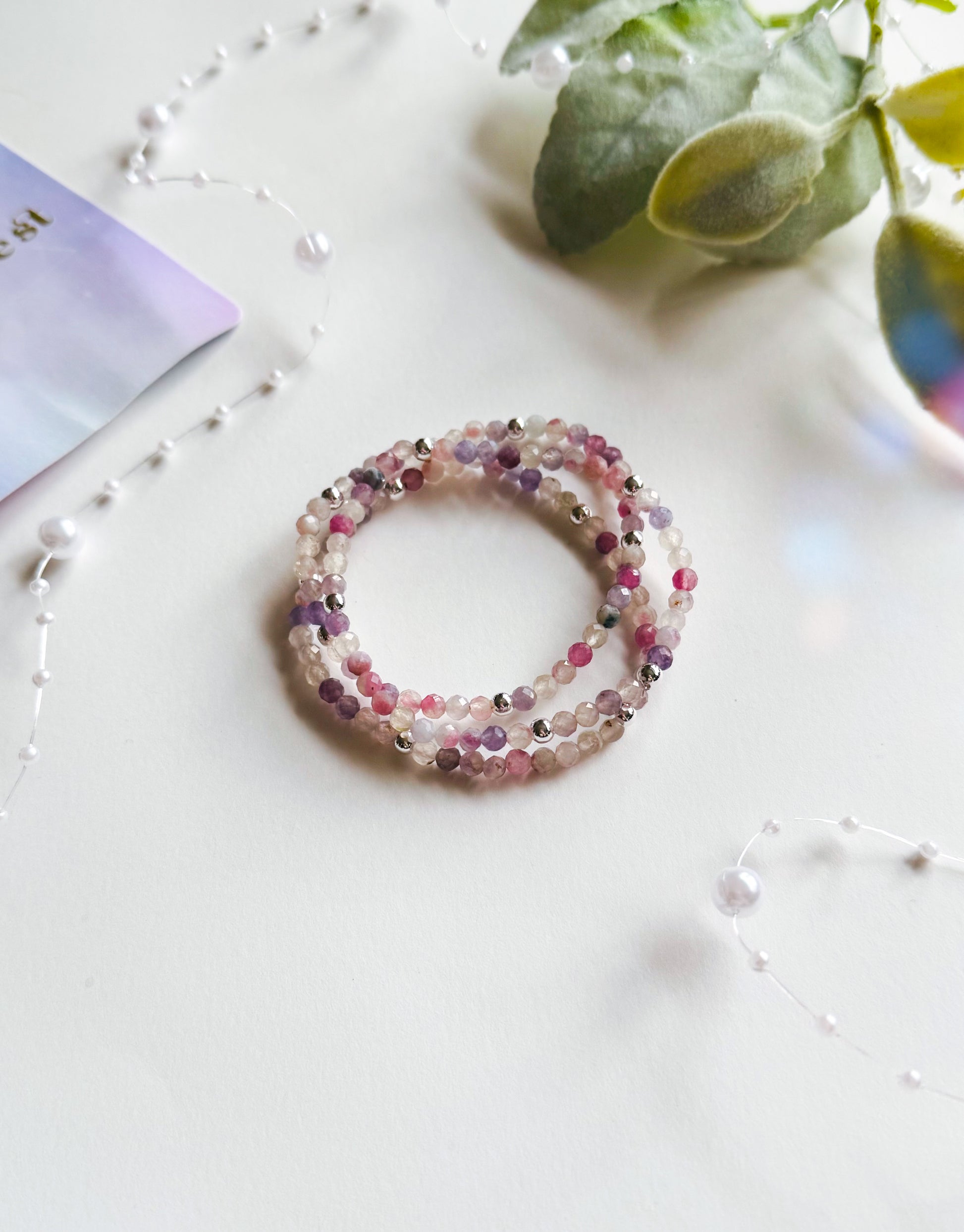 I bought this bracelet with three others and they look gorgeous stacked together. I love the pink and purple hues in this bracelet. It really brings out the colours in the other bracelets. And Katherine is amazing to work with! I highly recommend Little Lotus Designs for all your gemstone jewelry needs! I'm a repeat customer. I already have my next order on it's way and will continue to order from Katherine.