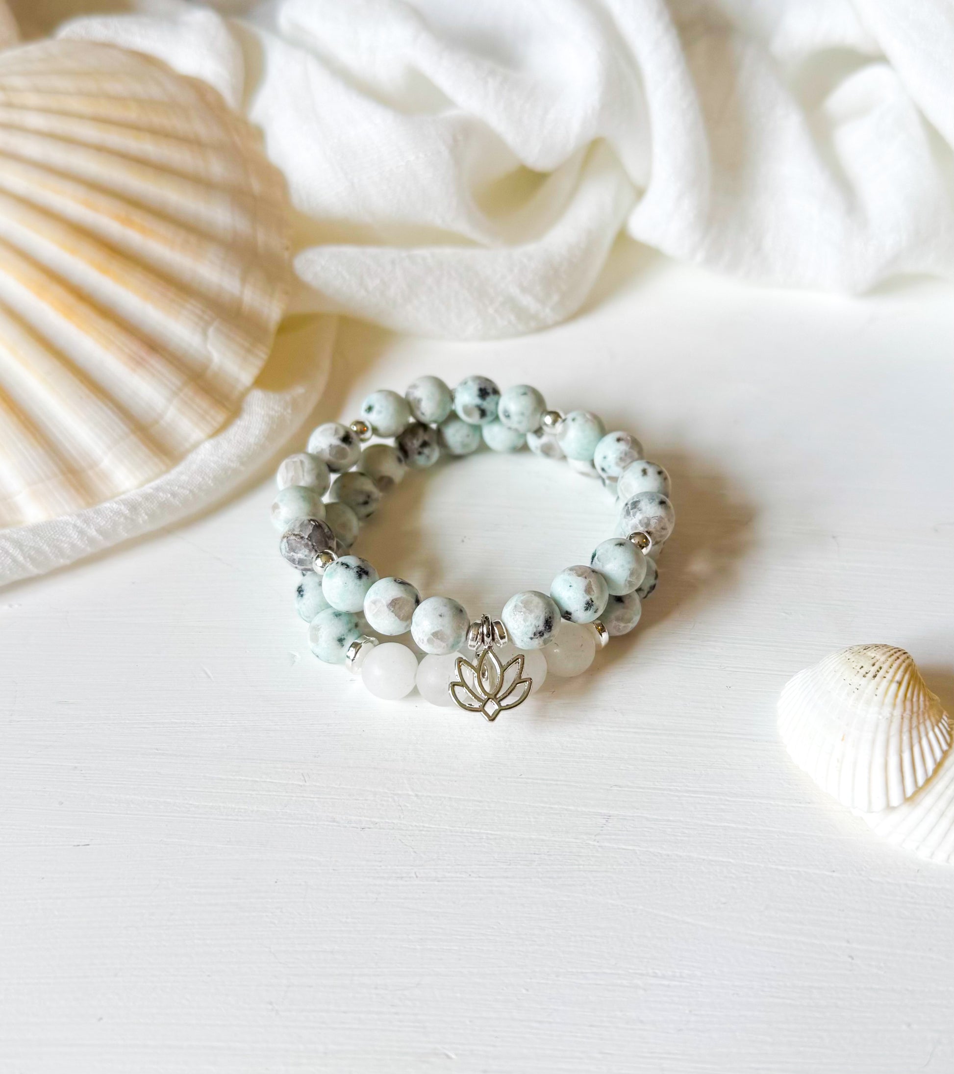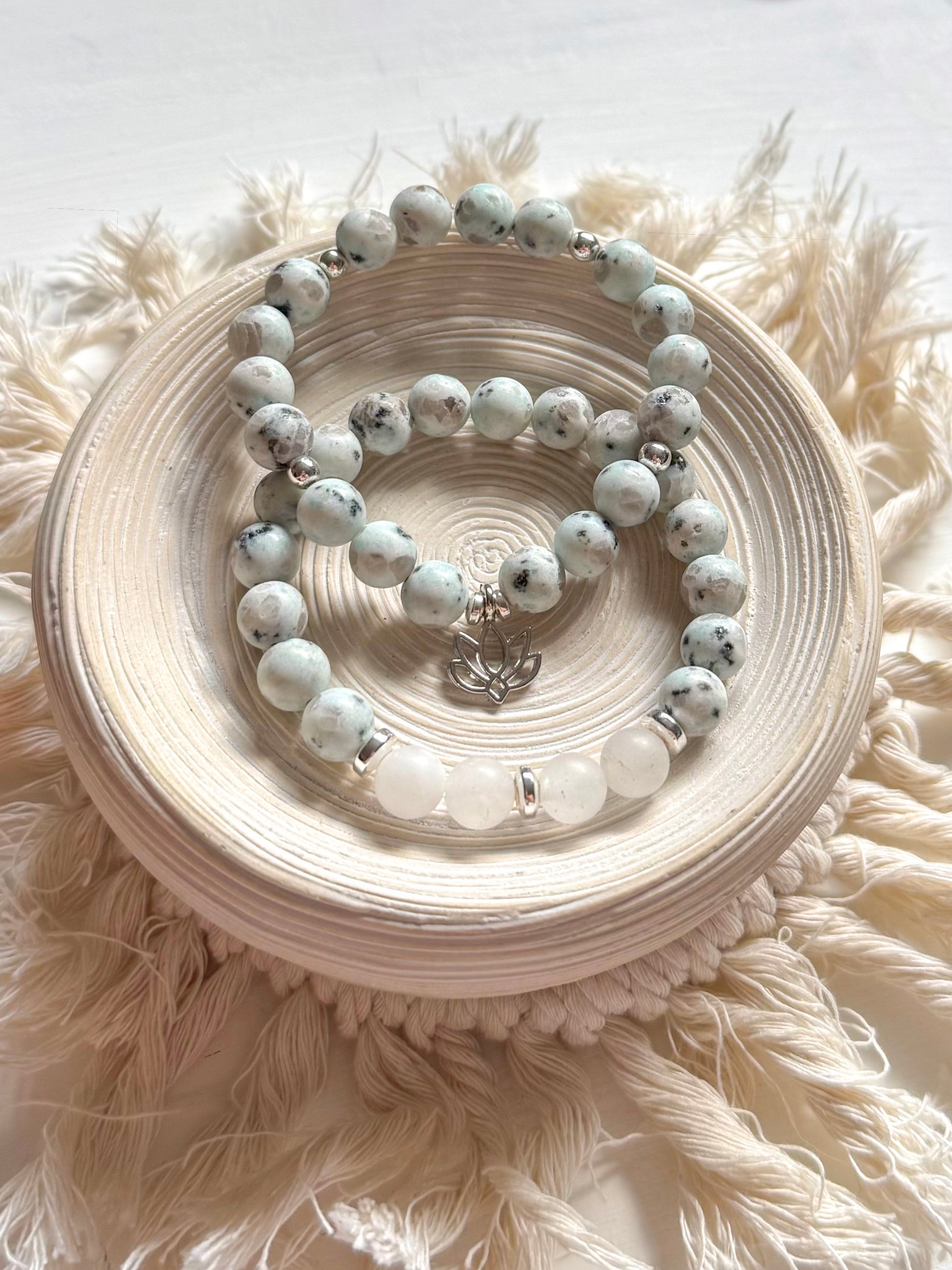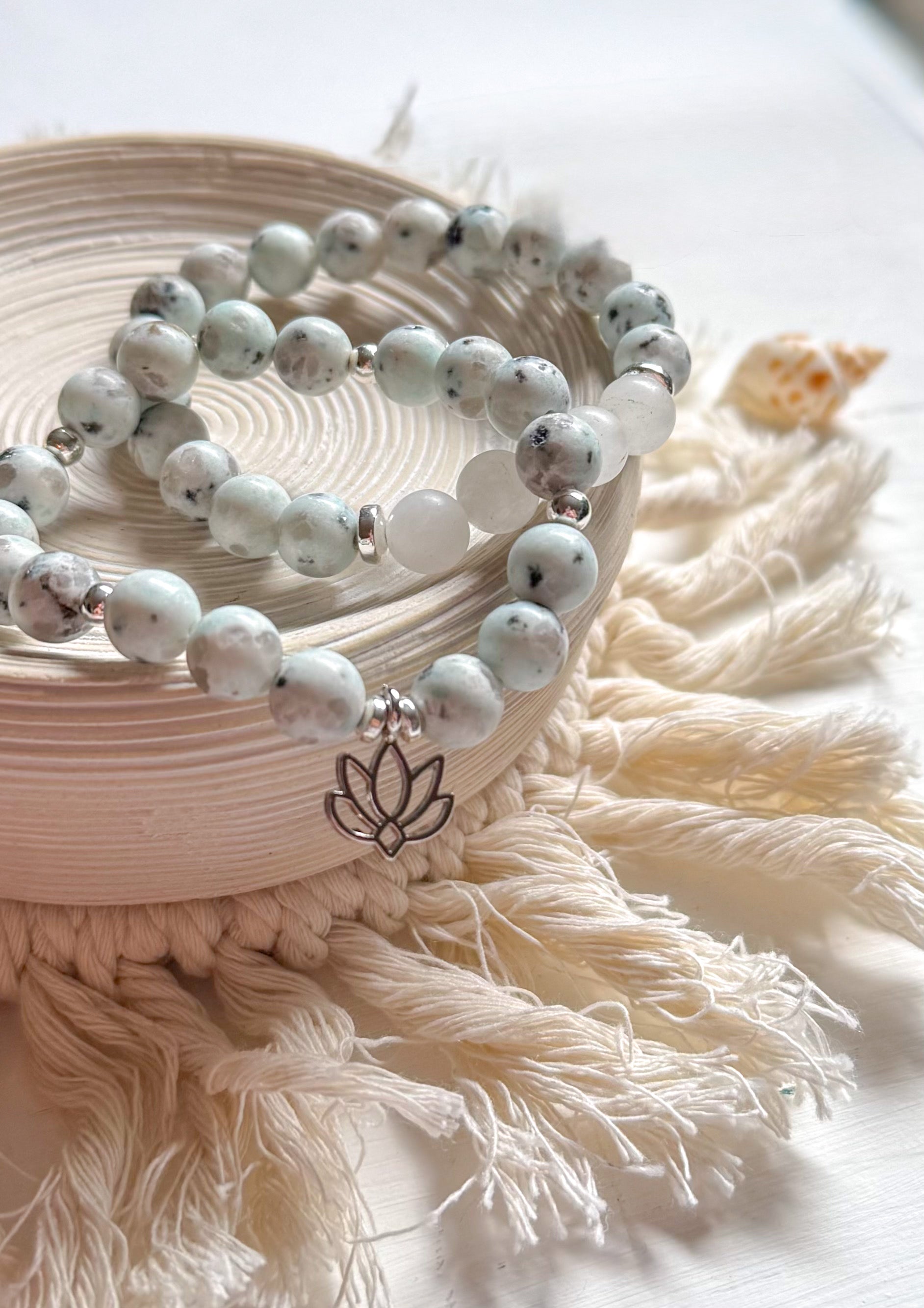 Finished with a delicate silver lotus charm, the Kiwi Cove Set symbolizes growth, purity, and inner strength—blooming through life’s murky waters with grace.