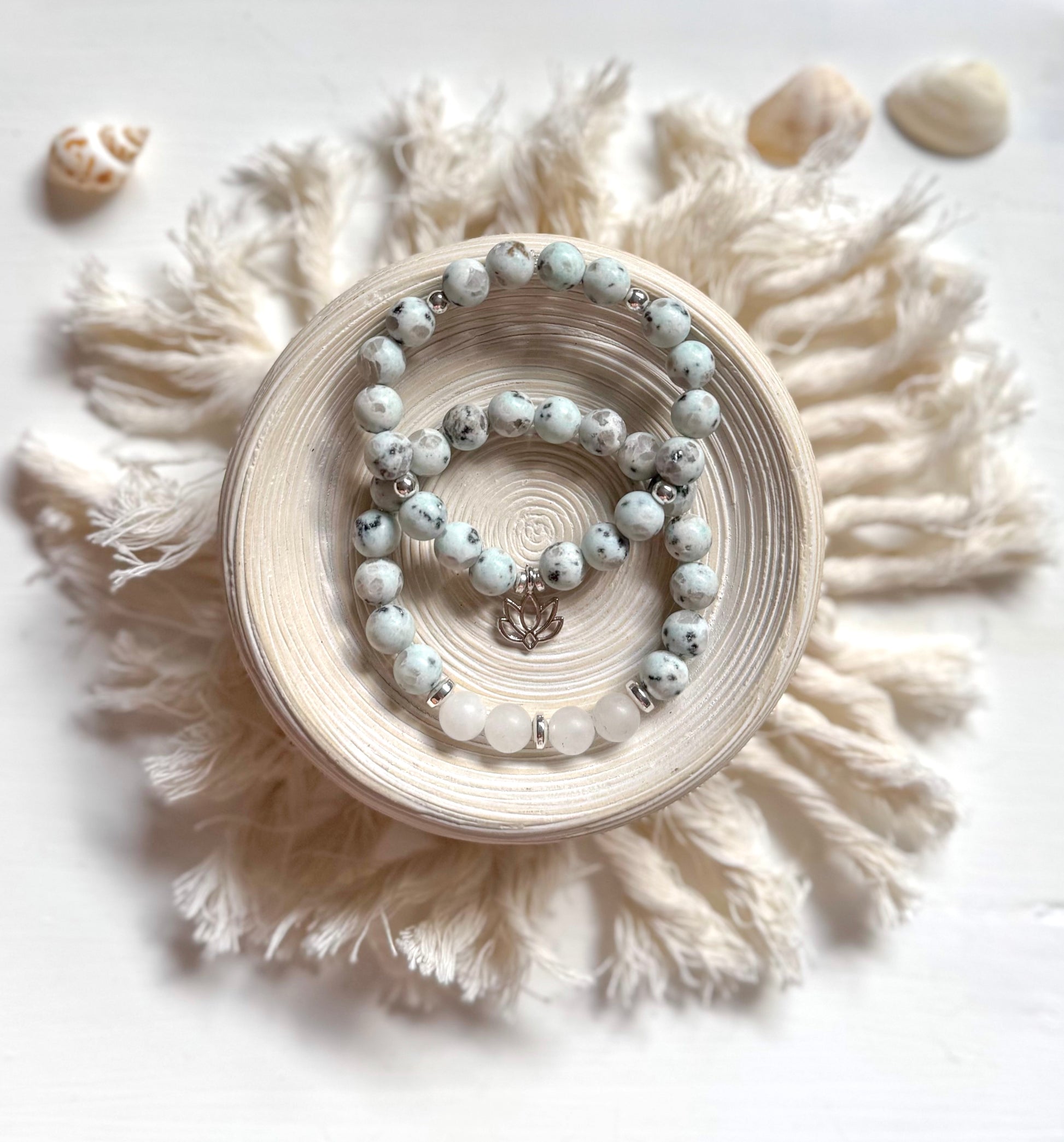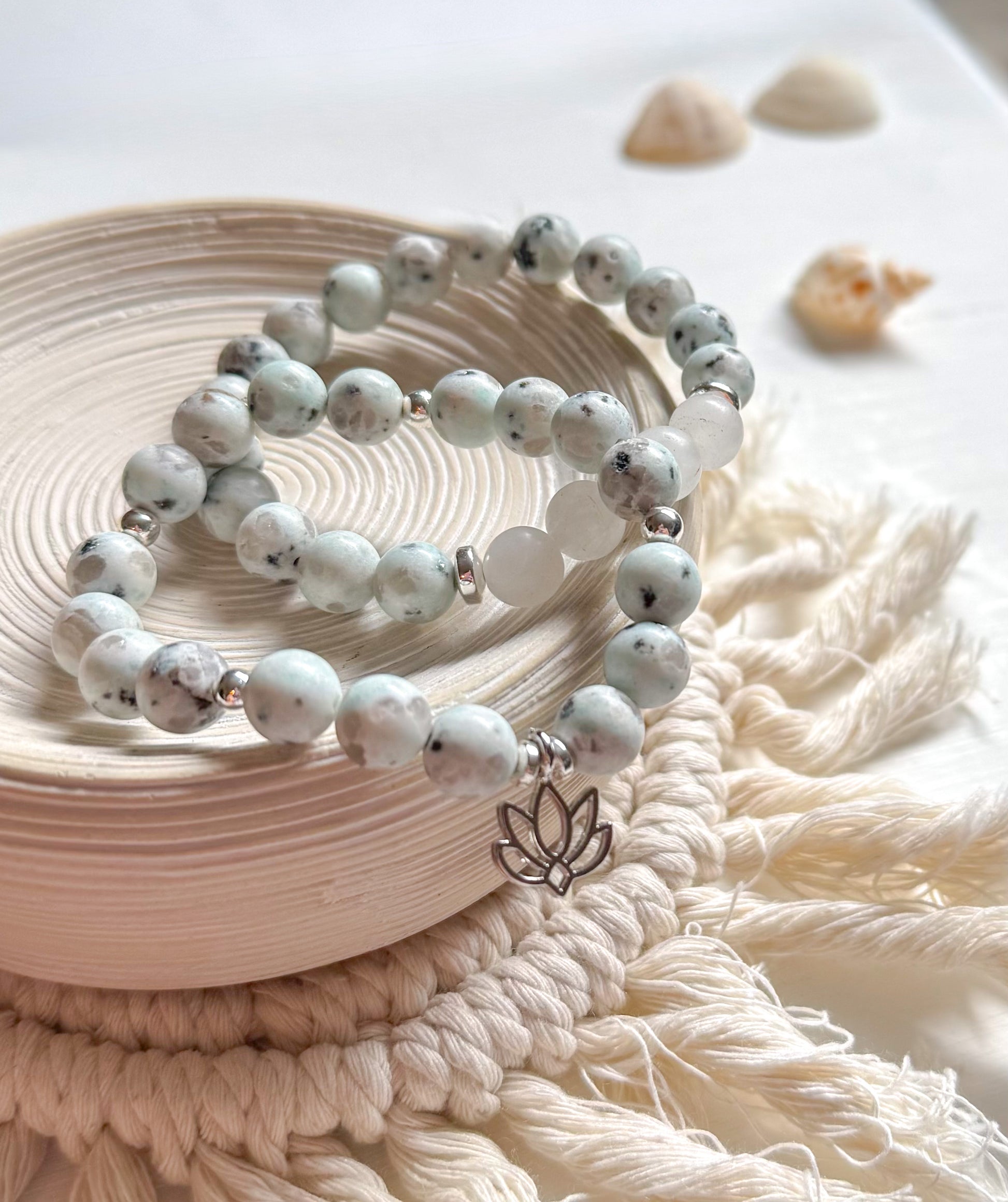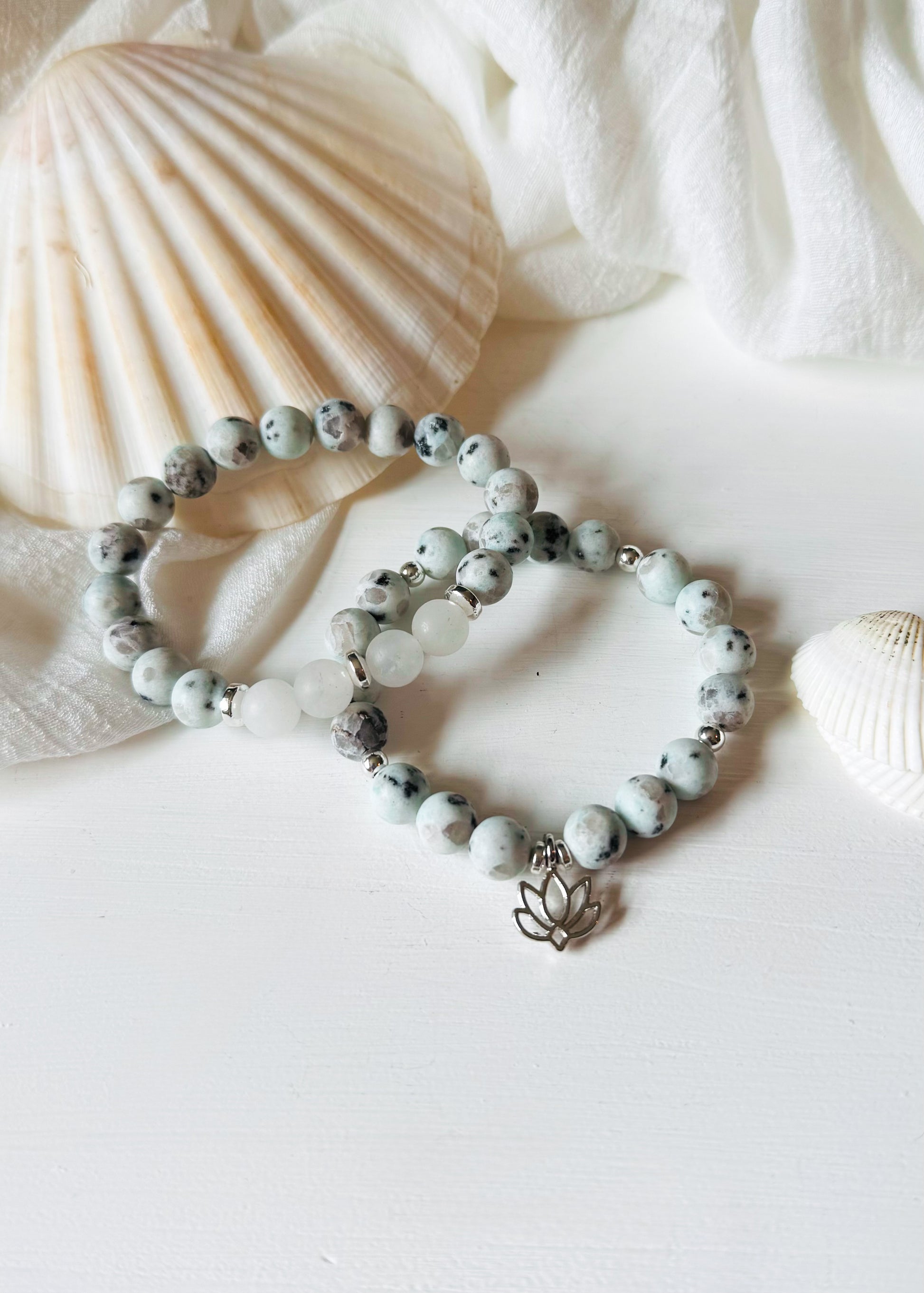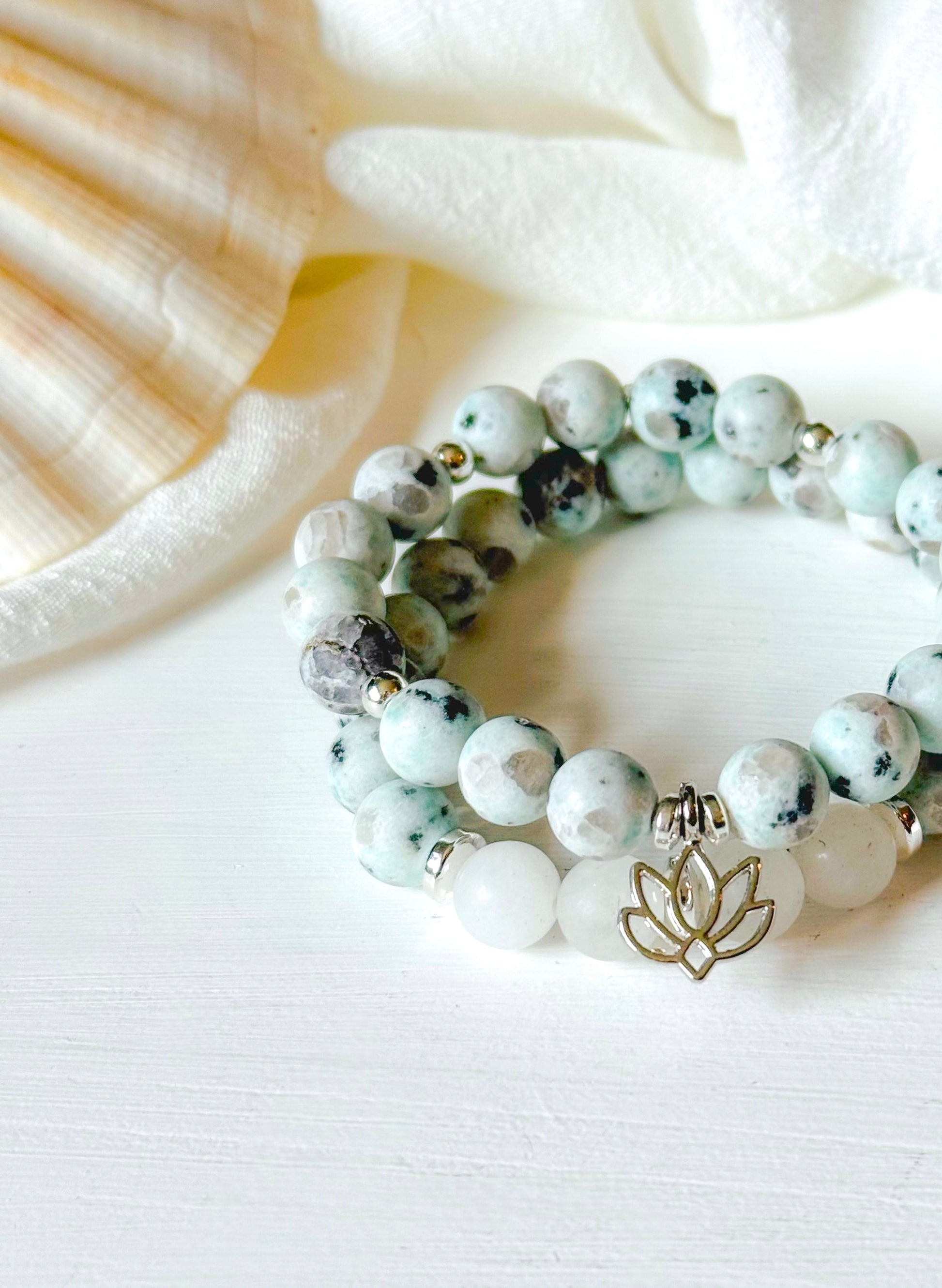 Finished with a delicate silver lotus charm, the Kiwi Cove Set symbolizes growth, purity, and inner strength—blooming through life’s murky waters with grace.