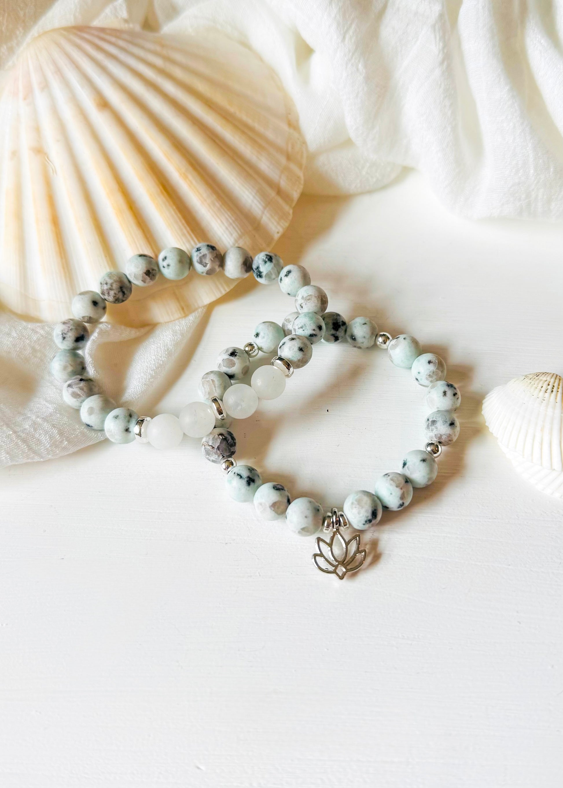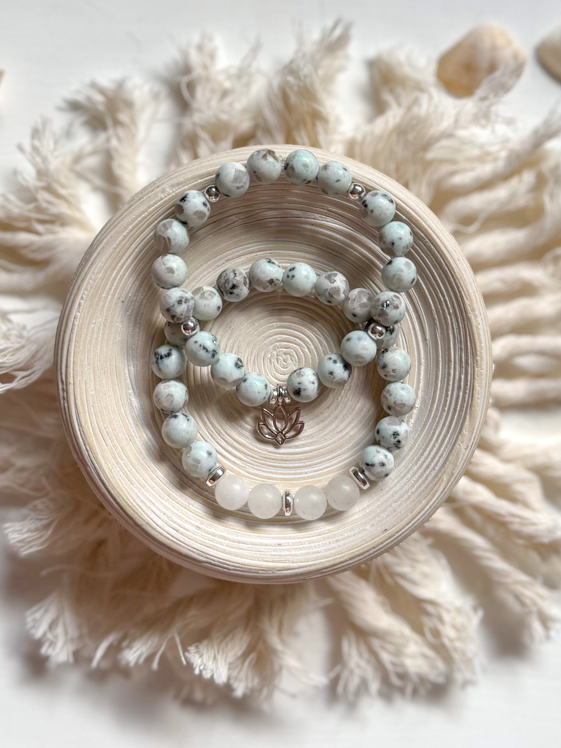 The Kiwi Cove Set is a serene pairing of Kiwi Jasper and Frosted White Jade, designed to ground your spirit and clear your mind.