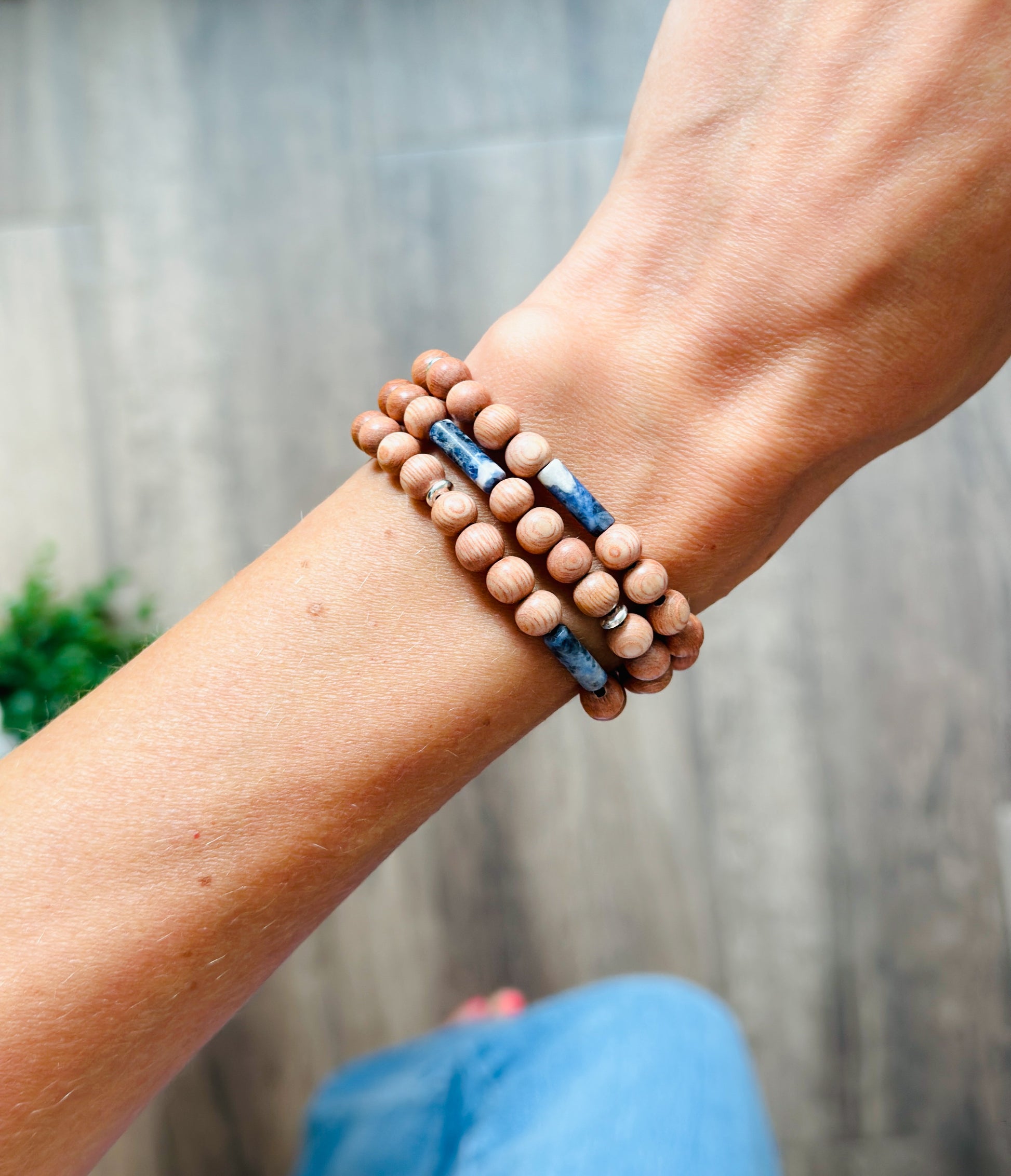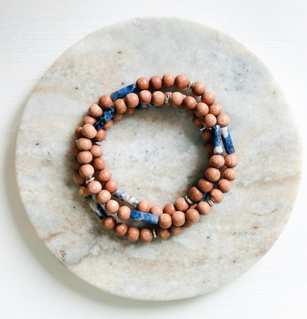 This exquisite bracelet showcases the soothing beauty of Rosewood beads, promoting a connection to nature and grounding energy. Nestled amidst this natural elegance are Sodalite tube gemstone beads, each possessing powerful healing properties to enrich your life. Sodalite is renowned for its ability to foster inner peace, stimulate intuition, and encourage self-awareness, making it an invaluable aid for personal growth and emotional healing. Sodalite is often referred to as the stone of peace because of its harmonious and soothing energy. It helps us calm the mind and ease panic attacks. It is very helpful in preventing us from becoming too emotional.
