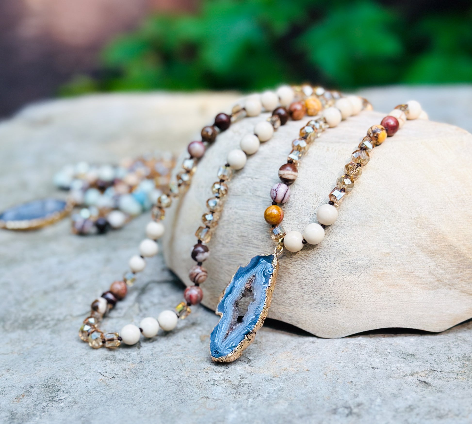 The Ayla gemstone necklace showcases a captivating blend of healing properties, featuring a Druzy agate geode pendant, complemented by Riverstone Jasper and glass beads. The Druzy agate geode pendant, adorned with sparkling crystals, offers a calming and grounding effect, alleviating stress and anxiety. Riverstone Jasper, a nurturing stone, promotes emotional balance, inner strength, and vitality. The inclusion of glass beads adds a touch of elegance while amplifying the energetic qualities of the gemstones. The Ayla necklace not only serves as a stunning accessory but also harnesses the collective healing energies of its components, offering a sense of serenity, rejuvenation, and overall well-being to its wearer.