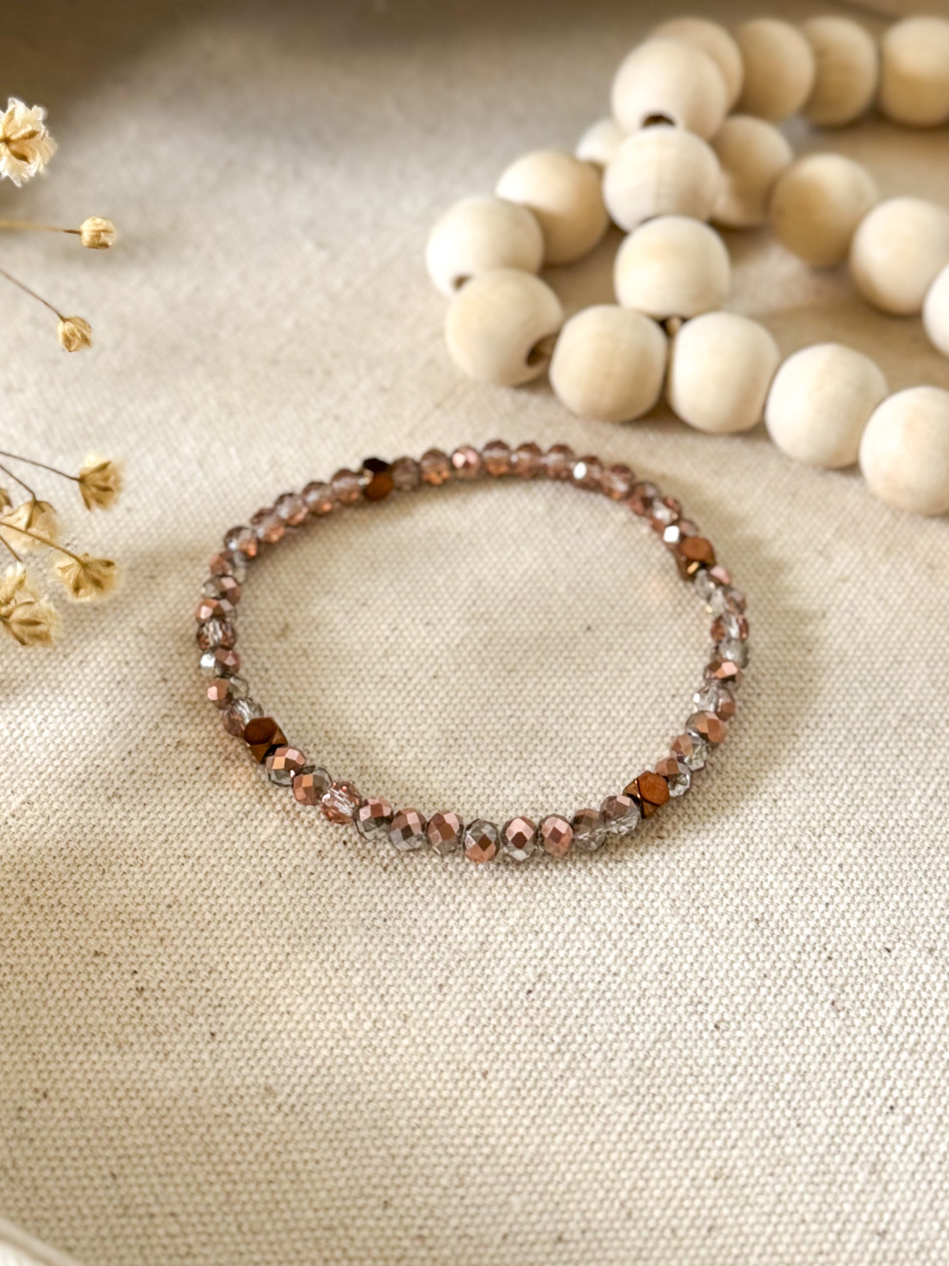 Capture the serene glow of twilight with The Bronze Dusk Mini. This 4mm bracelet is handcrafted with bronze glass beads and bronze hematite spacers, radiating earthy warmth and grounding energy.