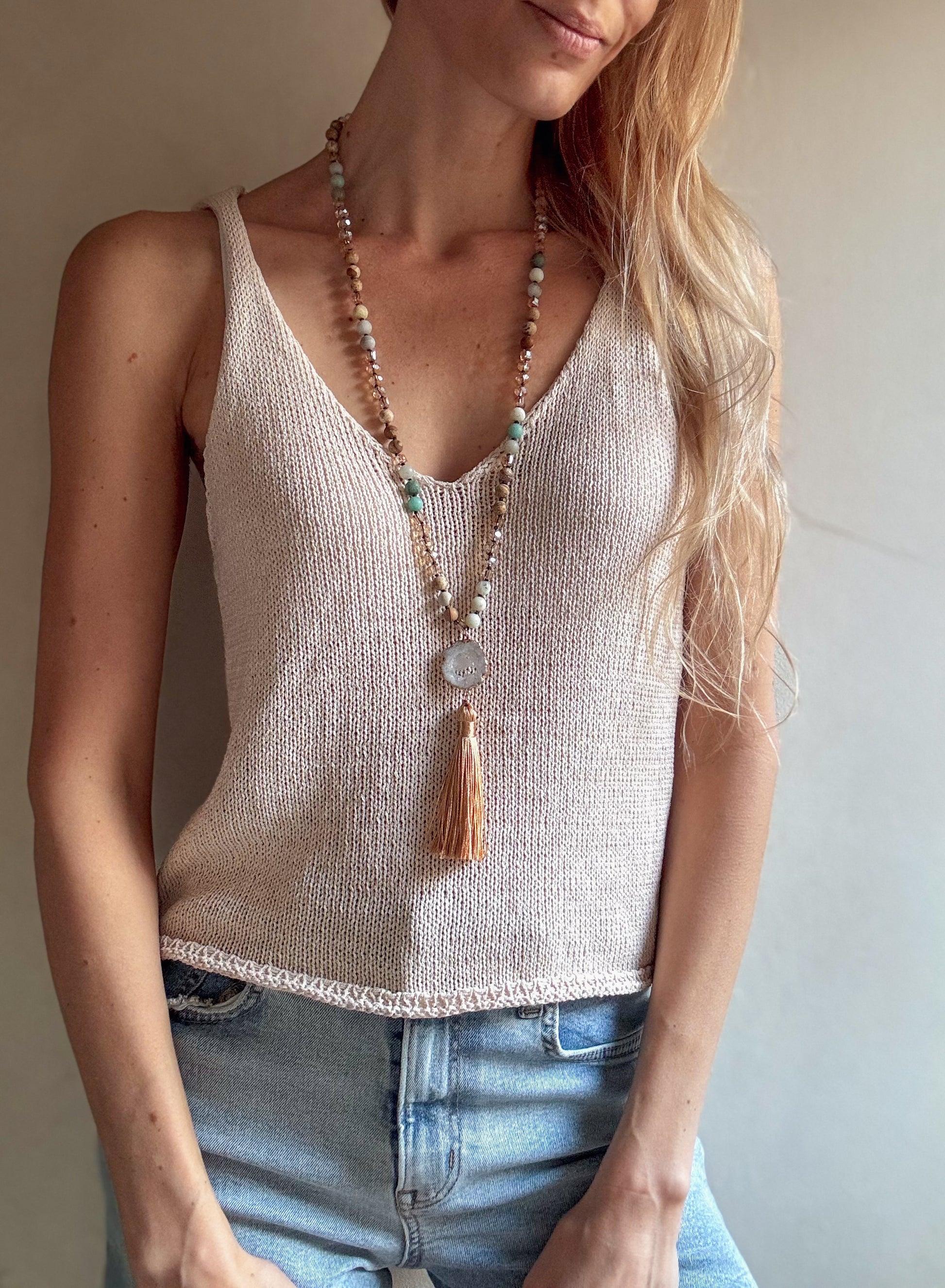 Wearing "The Brook" gemstone necklace invites the healing properties of Amazonite to reduce stress and anxiety while promoting harmonious communication and emotional well-being. The tassel, with its flowing movement, serves as a reminder of the importance of adaptability and going with the flow. The Druzy Agate pendant adds a touch of enchantment and grounds the wearer, boosting inner confidence and resilience. "The Brook" is a testament to the enduring connection between the natural world and our own journey towards healing and self-discovery. Whether worn as a statement piece or a daily affirmation, let it adorn you and empower your inner growth.