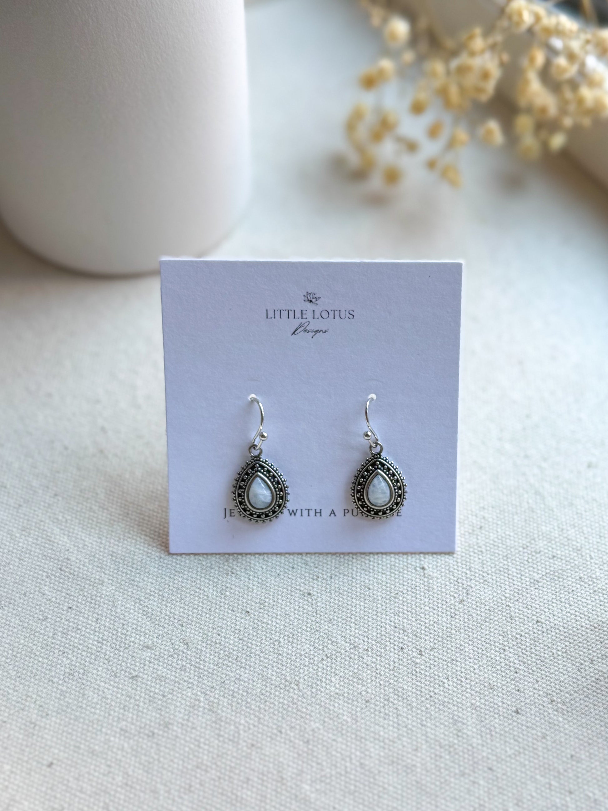 Moonstone, long revered as a gem of intuition, protection, and feminine energy, captures the mystery of moonlight—shifting and shimmering with every movement. Paired with the timeless depth of antique sterling silver, these earrings carry both grounding strength and ethereal beauty.
