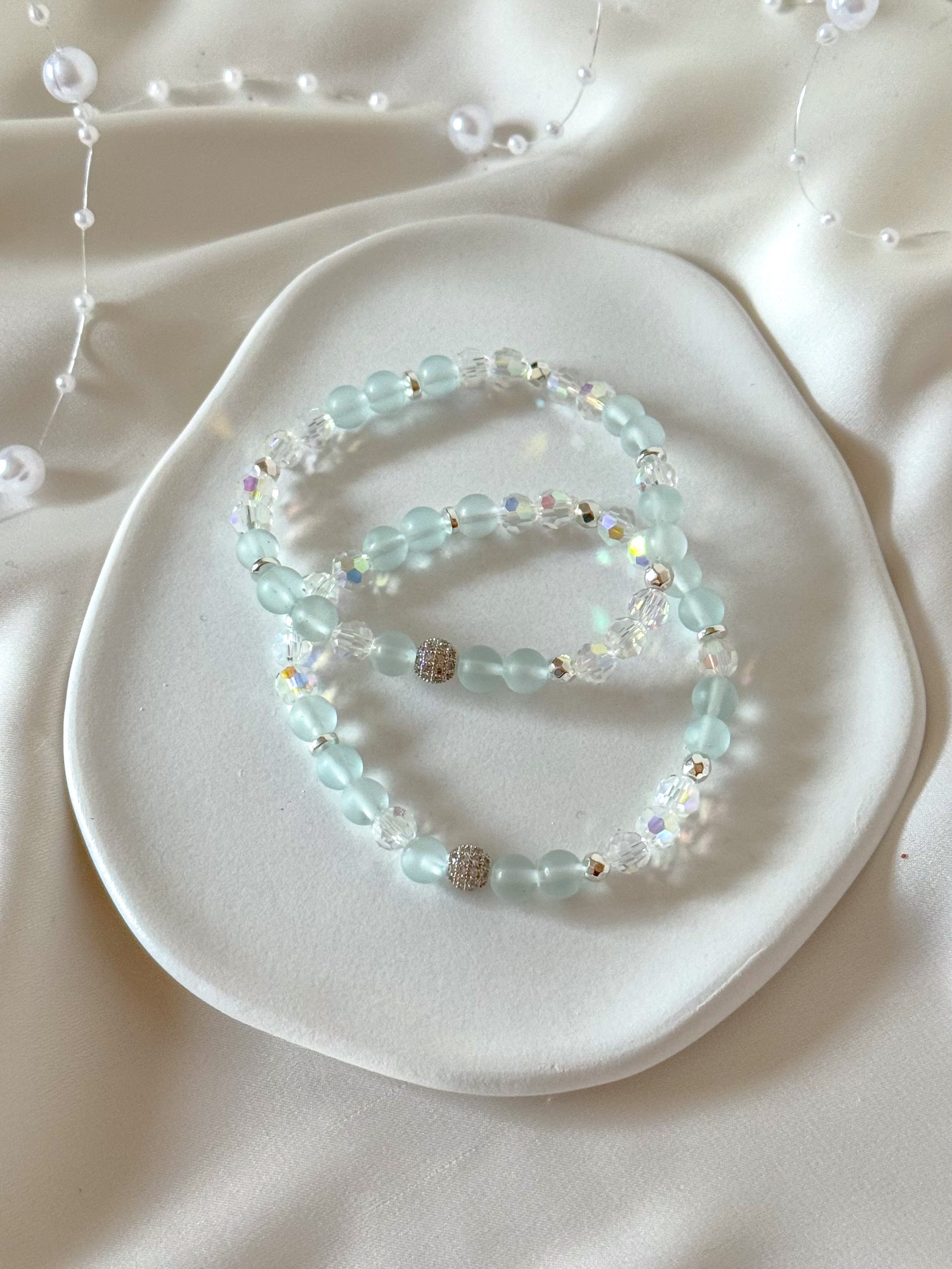 A touch of calm meets holiday sparkle. Created with soothing 6mm sea glass, delicate glass beads, and a radiant cubic zirconia sparkle ball, the Crystal Frost Bracelet captures the magic of winter light and quiet moments of peace.
