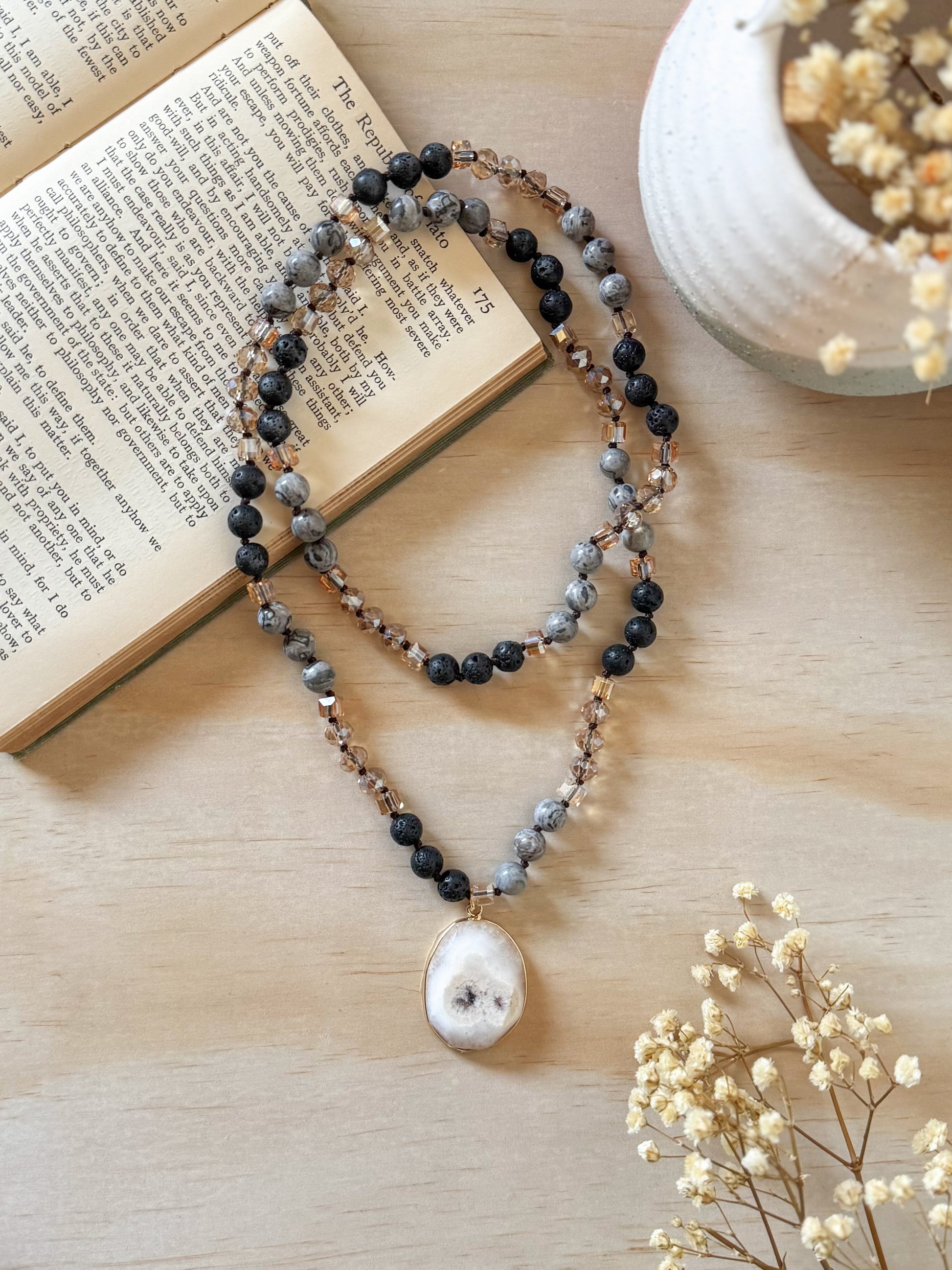 The Dreya Necklace combines the grounding energies of Grey Scenery Jasper and Lava Rock with elegant glass beads and a powerful Agate pendant, offering both style and healing properties.