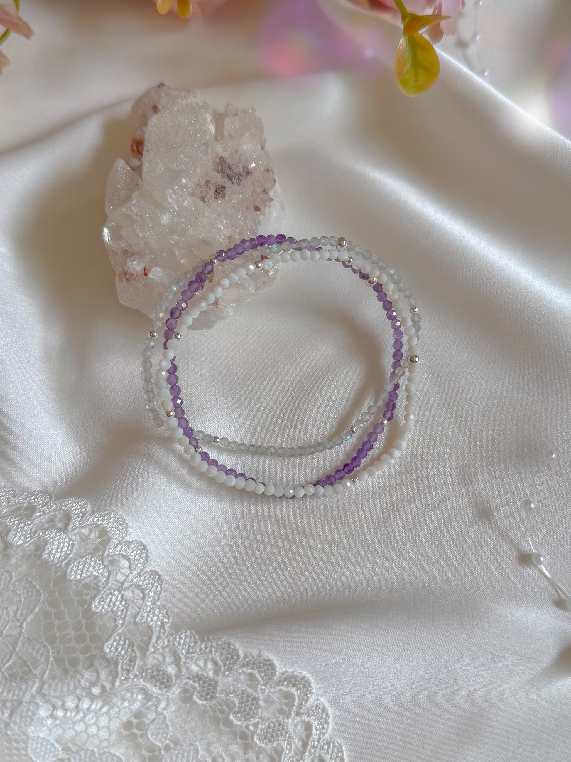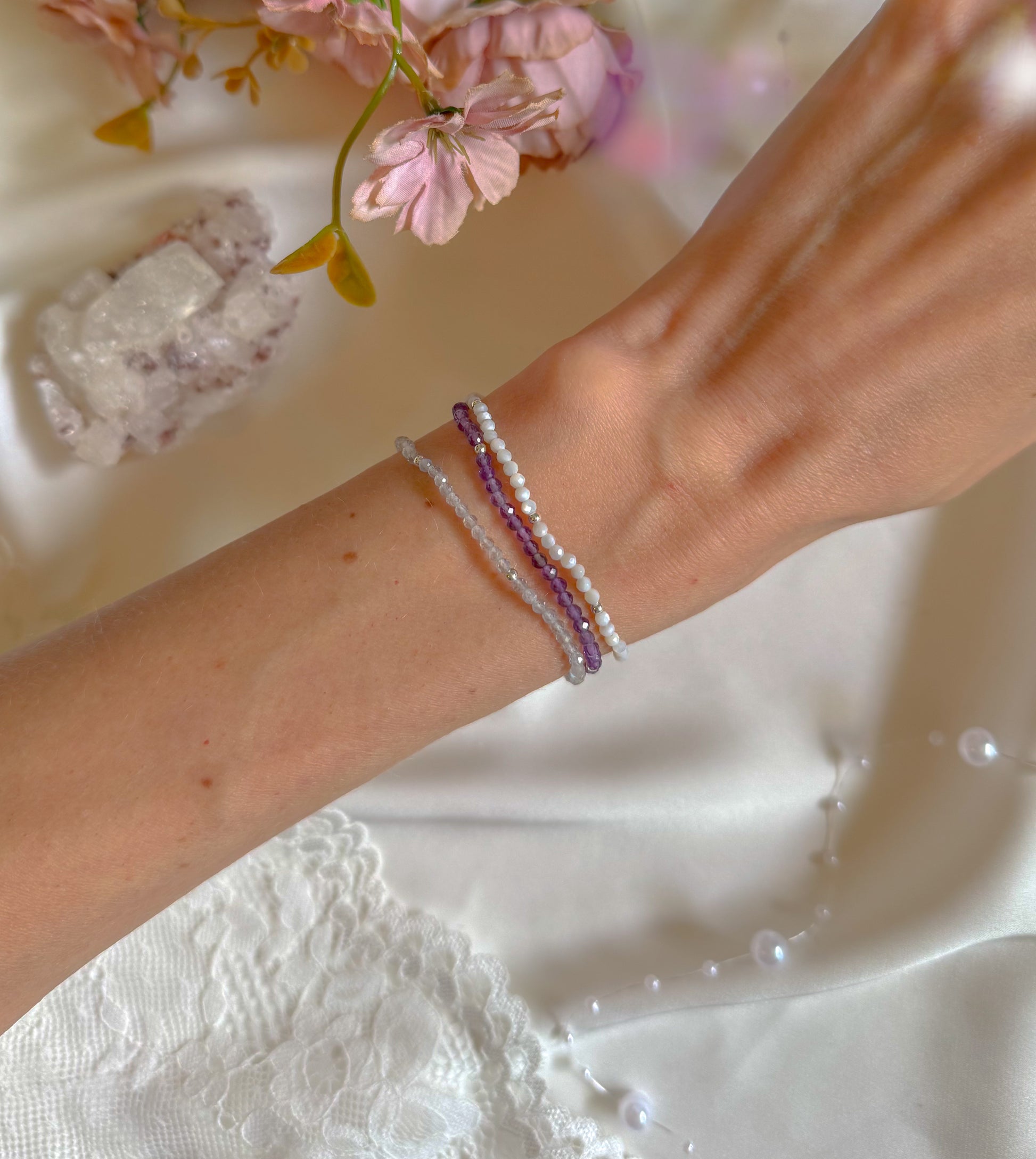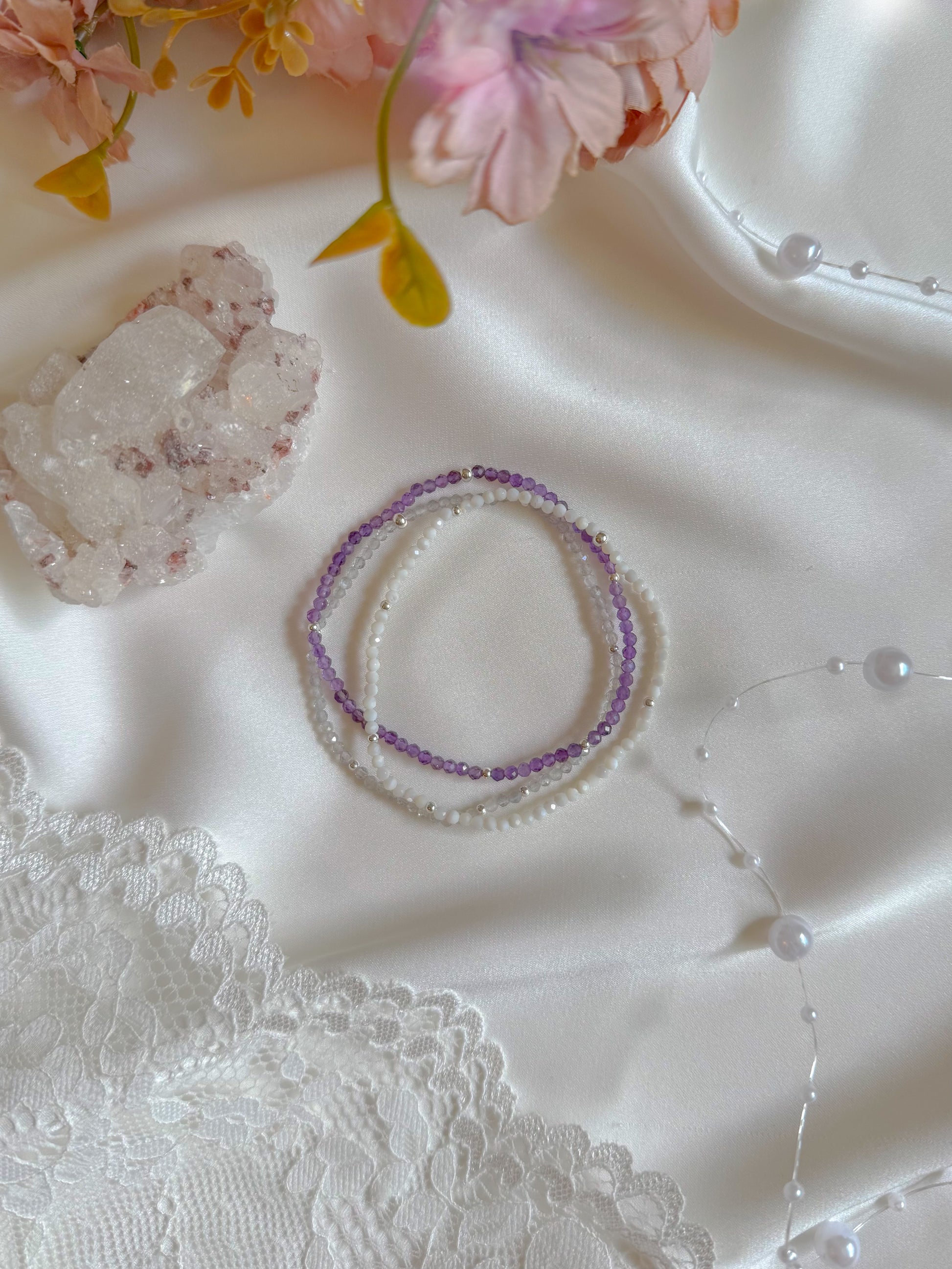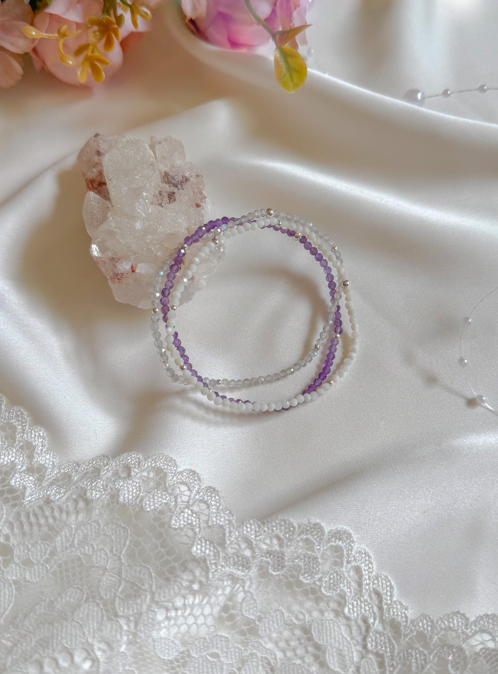 The Enchanted Horizon Set is designed to align your energy with possibility. Handcrafted with 2mm faceted amethyst, labradorite, moonstone, and sterling silver spacer beads, this delicate trio holds the essence of intention and transformation.