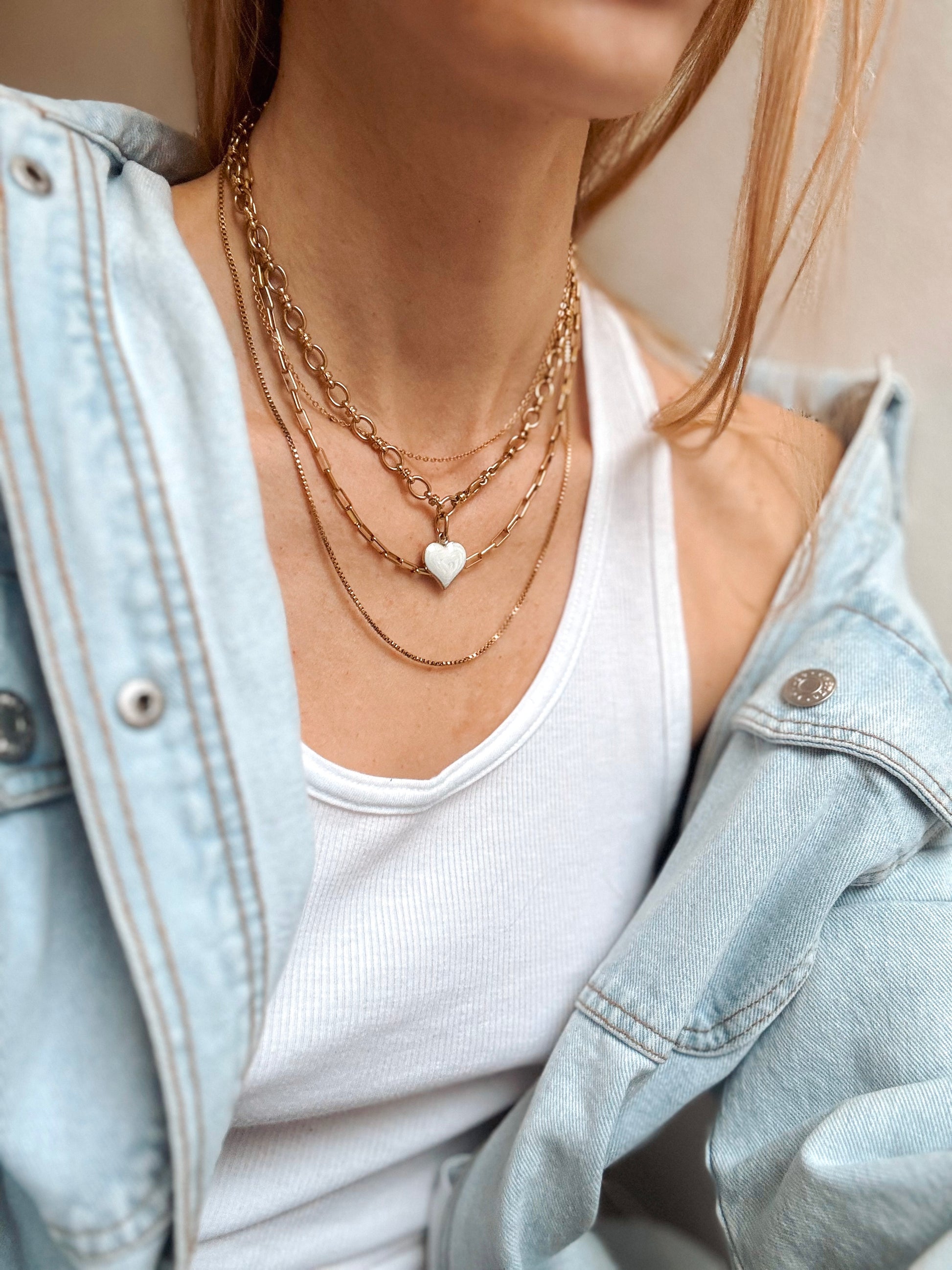 - 16” chain with 0.5” Mother of Pearl heart pendant