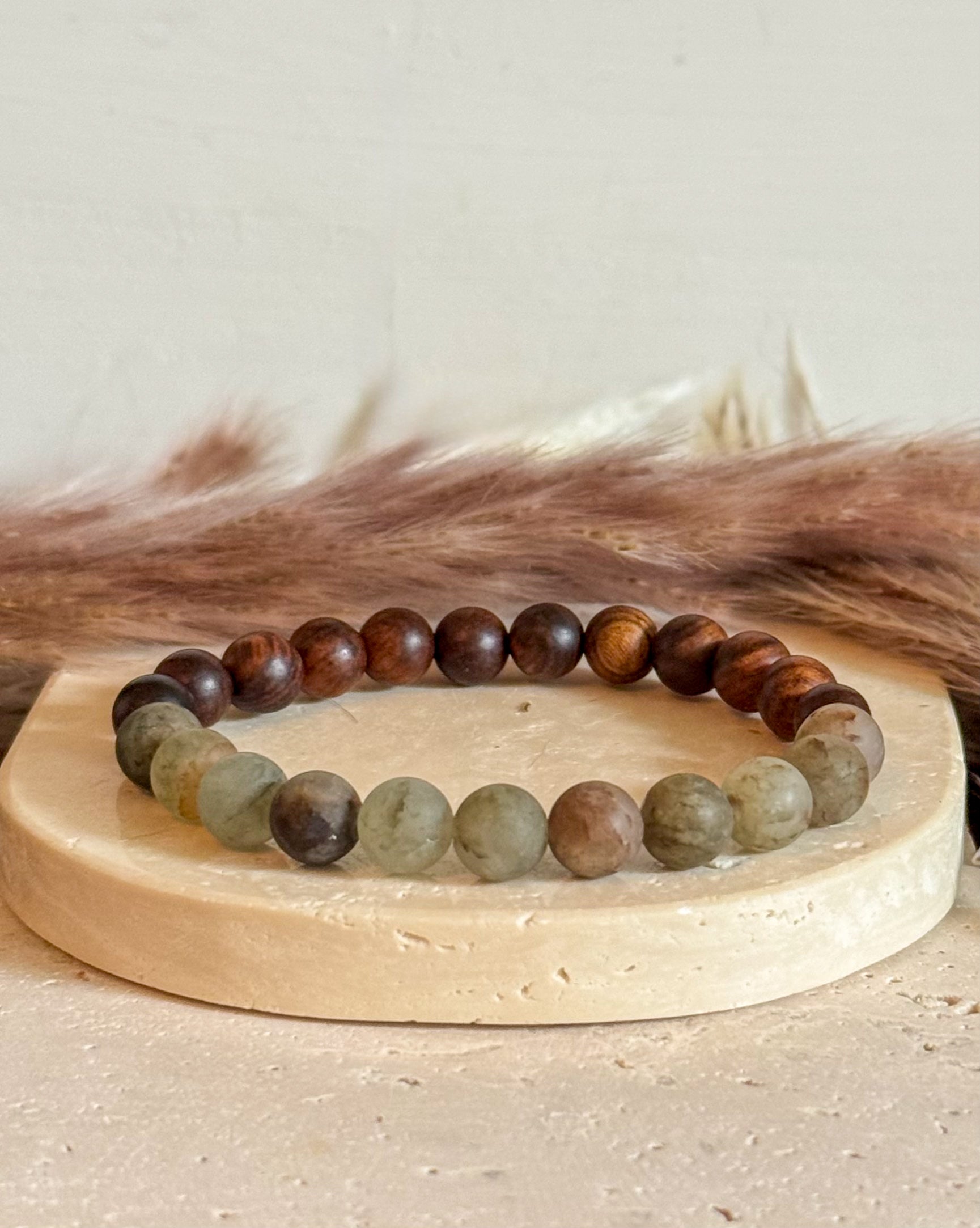 Embrace a harmonious blend of grounding energy and spiritual clarity with The Finn Bracelet. This thoughtfully crafted piece combines the mystical allure of Green Phantom Quartz, known for its growth, transformation, and heart-centered healing, with smooth, natural Sandalwood beads, bringing calm, balance, and connection to nature. Together, these elements create a bracelet that’s both a beautiful accessory and a subtle reminder to stay rooted while reaching for your highest potential.