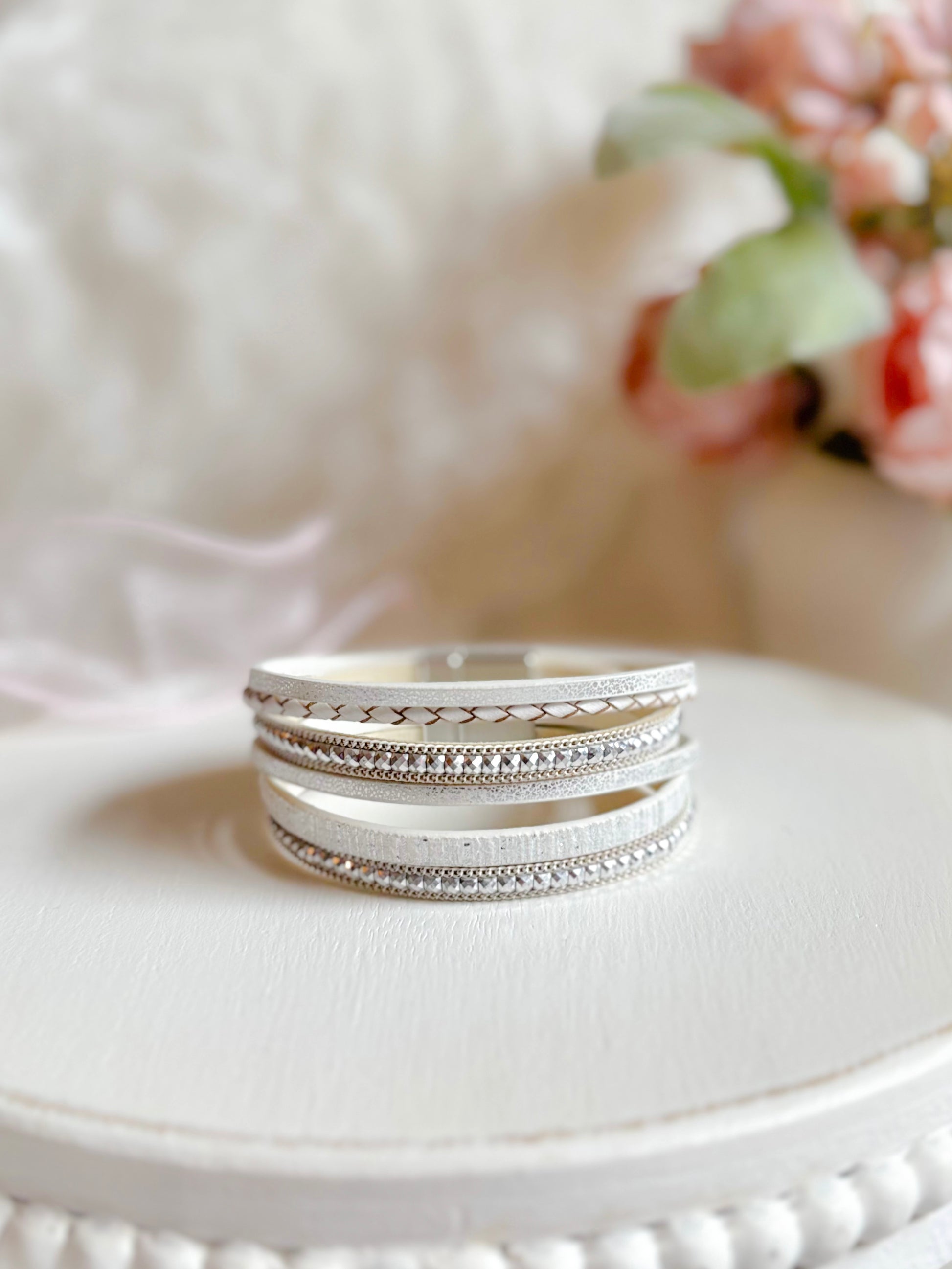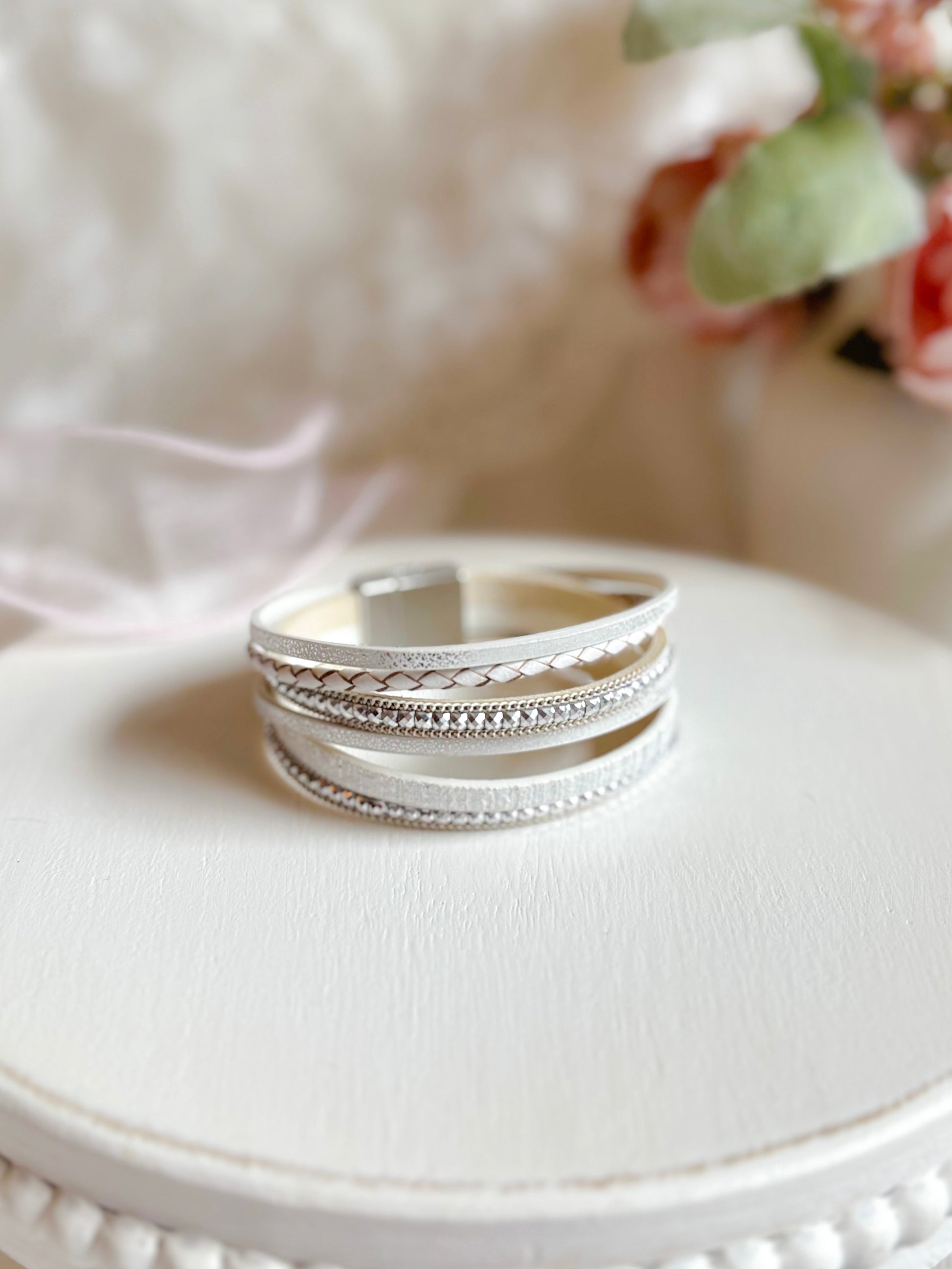 Embrace the magic of winter with Frosted Goddess, a leather wrap bracelet that blends strength and elegance. The supple leather wraps gracefully around your wrist, while the magnetic alloy clasp adds effortless convenience and a touch of sophistication. A statement piece that channels your inner goddess all season long.