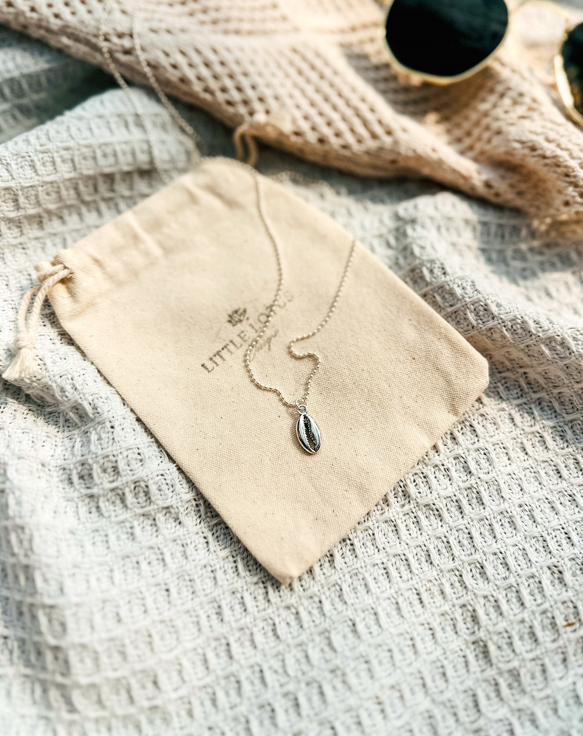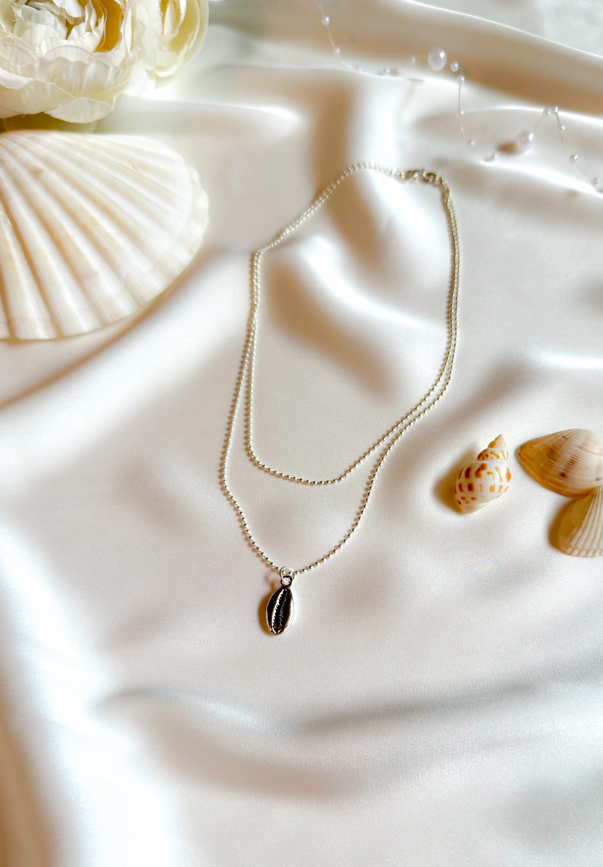 This elegant necklace features a beaded Sterling Silver chain that catches the light just right, and a detailed Silver cowrie shell pendant that channels ocean magic and timeless beauty.