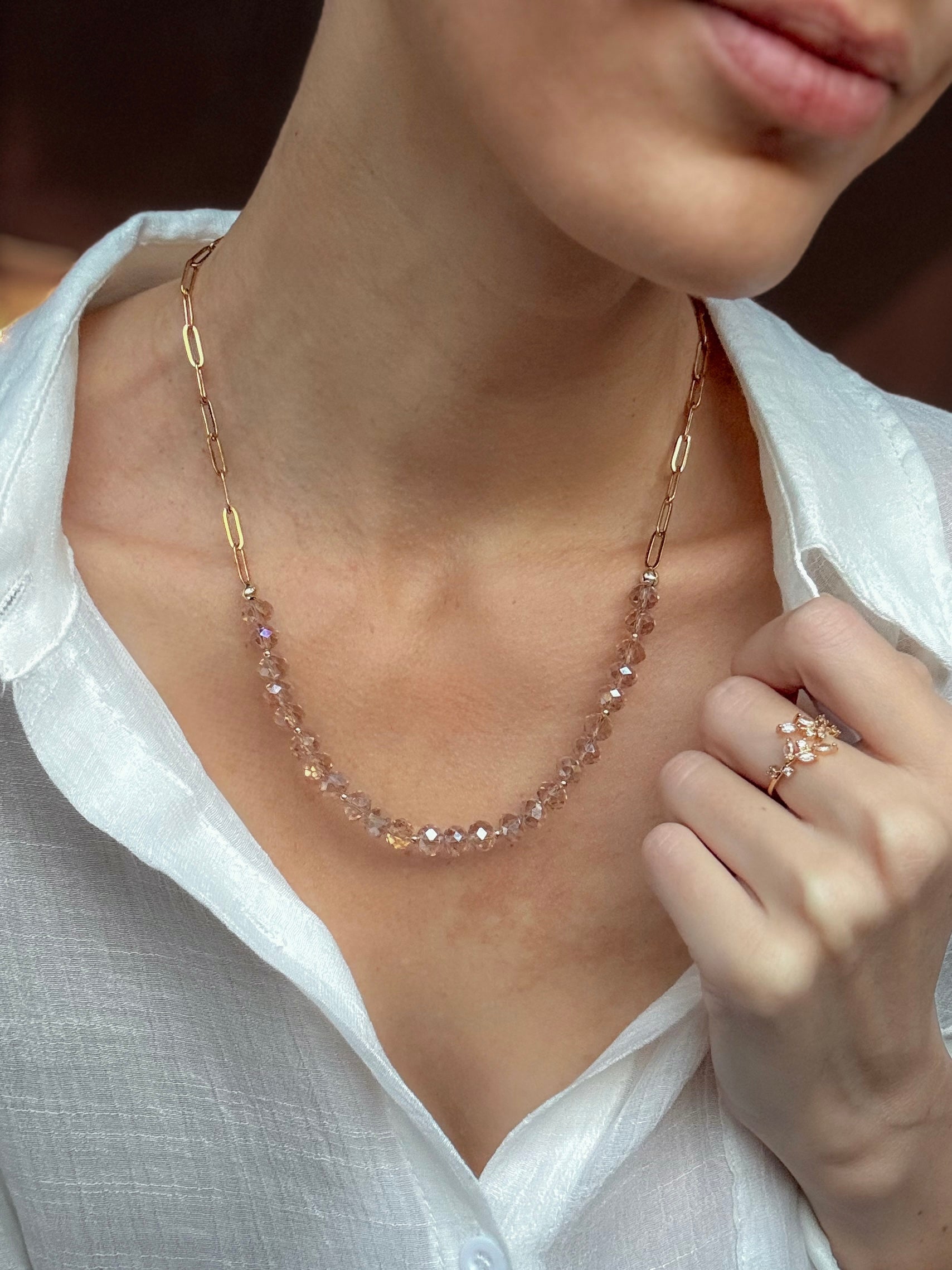 Crafted with 8mm glass beads that shimmer with every movement, this necklace is accented with 18k gold spacers and a sleek 18k gold paper clip chain, blending strength with luxury.