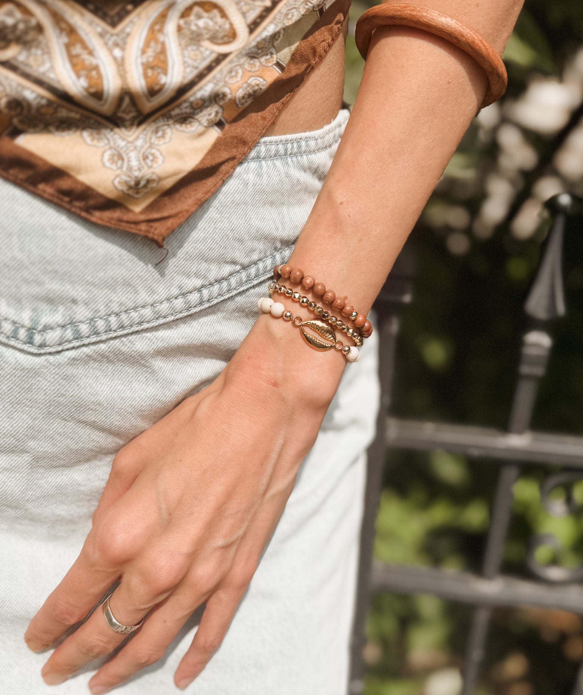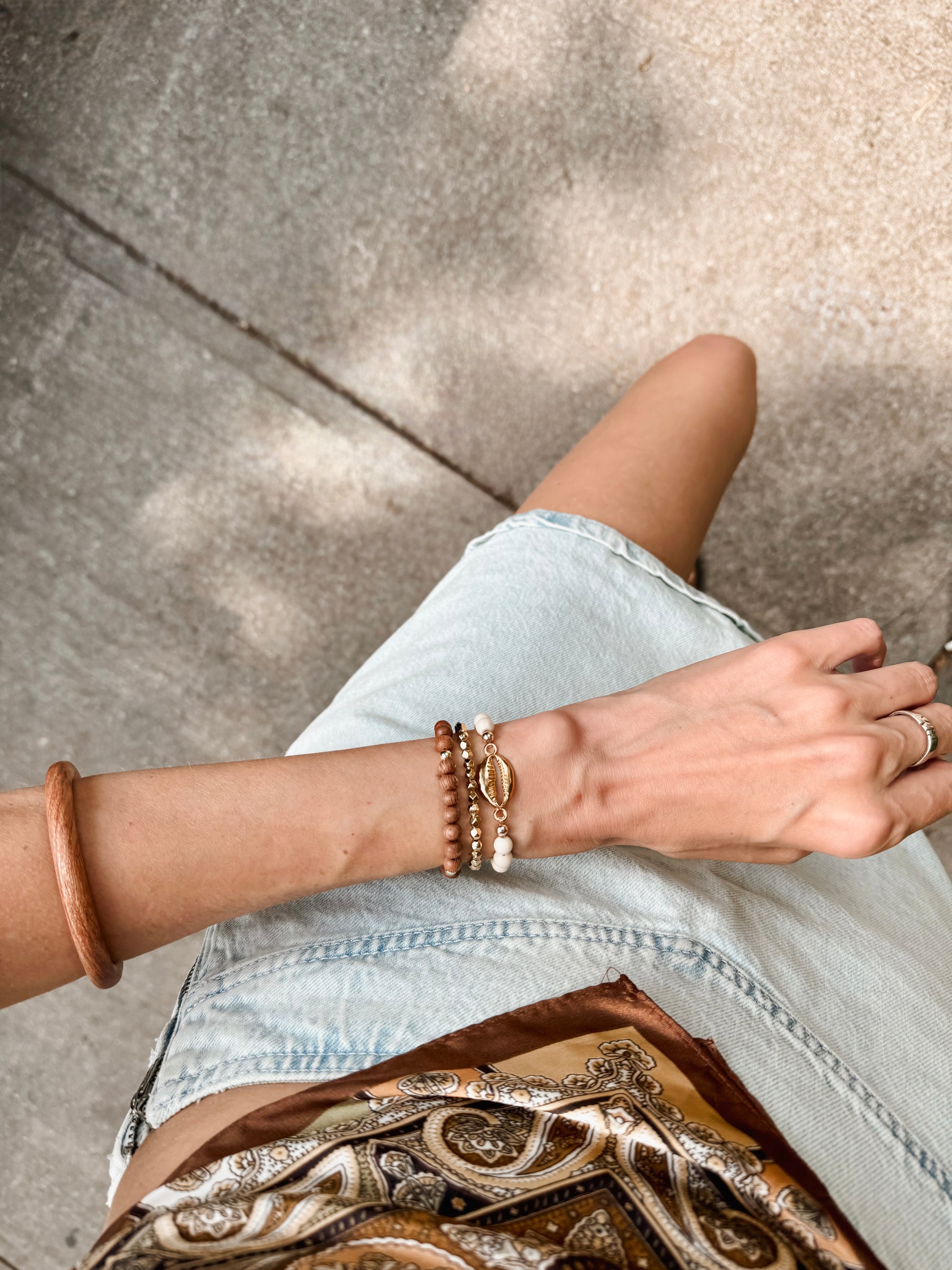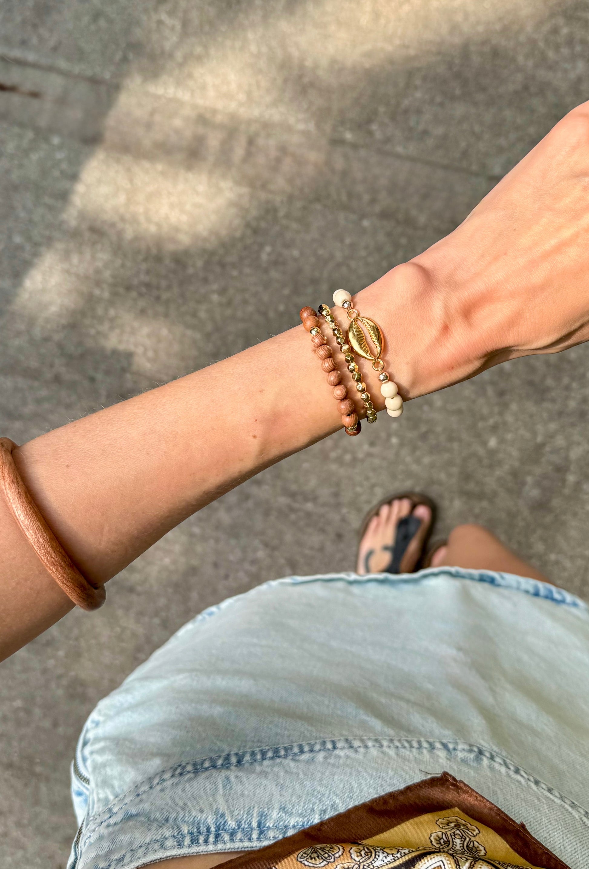 Introducing The Kaiya Set, a beautiful bracelet collection featuring Riverstone Jasper, Rosewood, gold faceted Hematite, and pearl shell beads with a gold conch connector.
