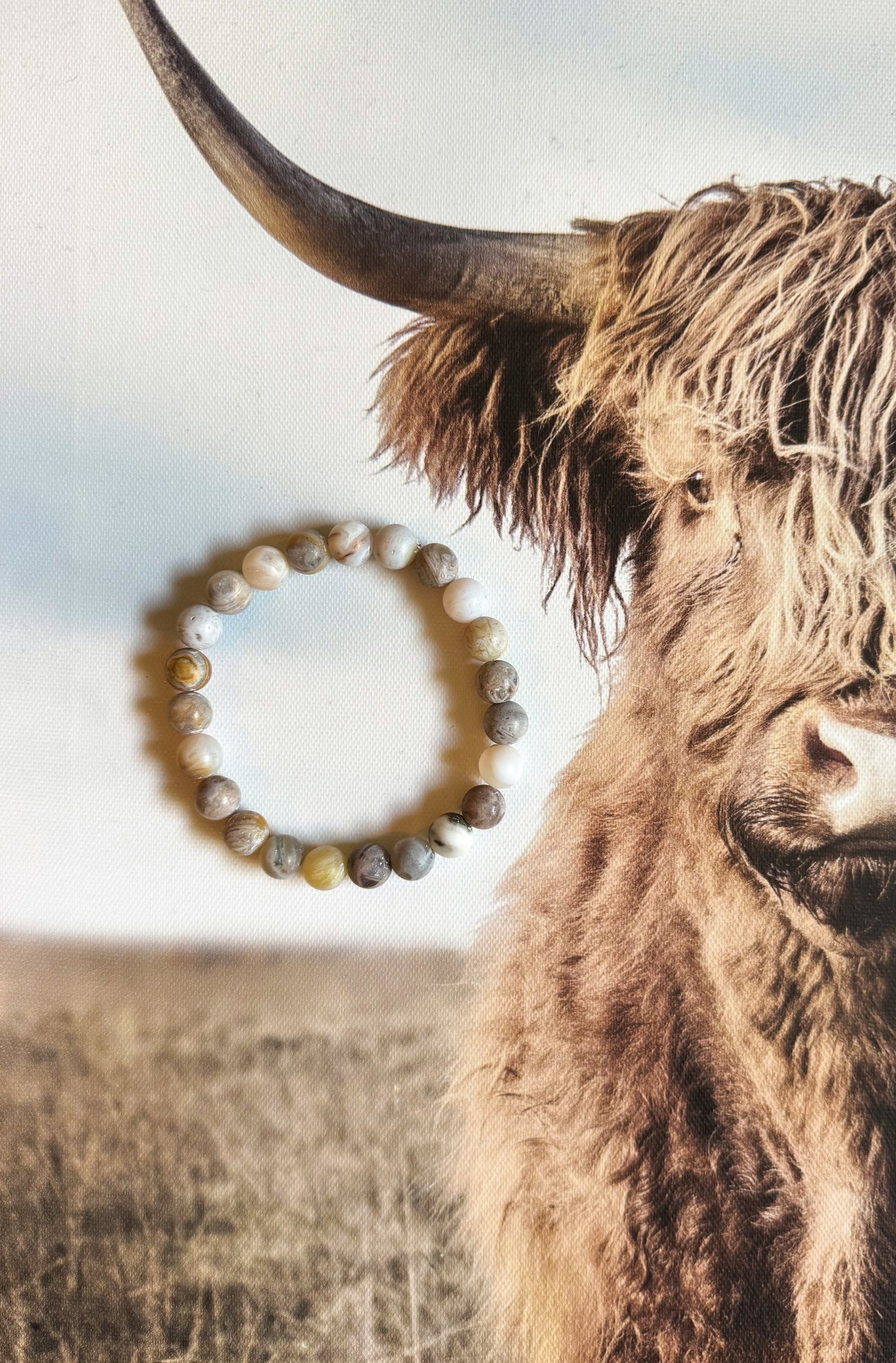 Crafted with earthy matte bamboo leaf agate, The Lonestar Bracelet is a tribute to quiet strength and unwavering individuality. Each stone carries soft, natural tones — like desert stone and weathered trails — grounding the spirit and calming the mind.