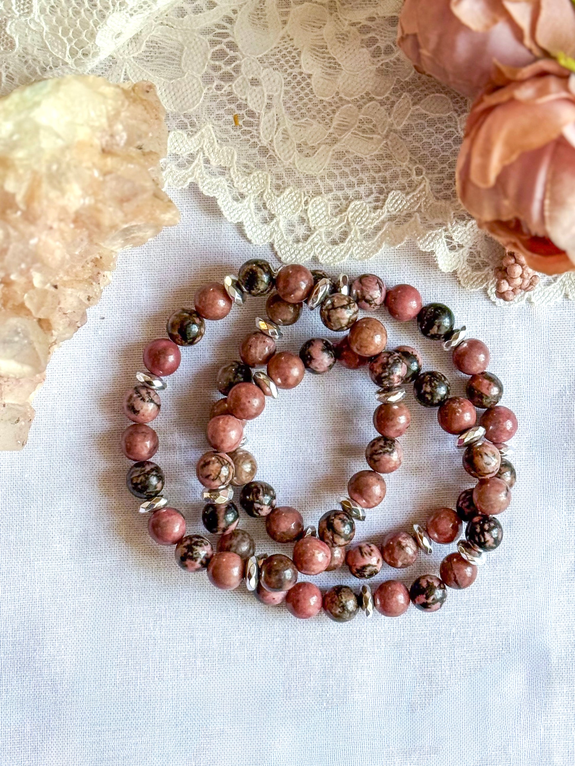 Handcrafted with natural Rhodonite in soft dusty-rose tones and deep charcoal veining, The Mara Bracelet embodies resilience and heart-led healing. Faceted Silver Hematite spacers add a subtle metallic edge while enhancing the bracelet’s grounding energy.