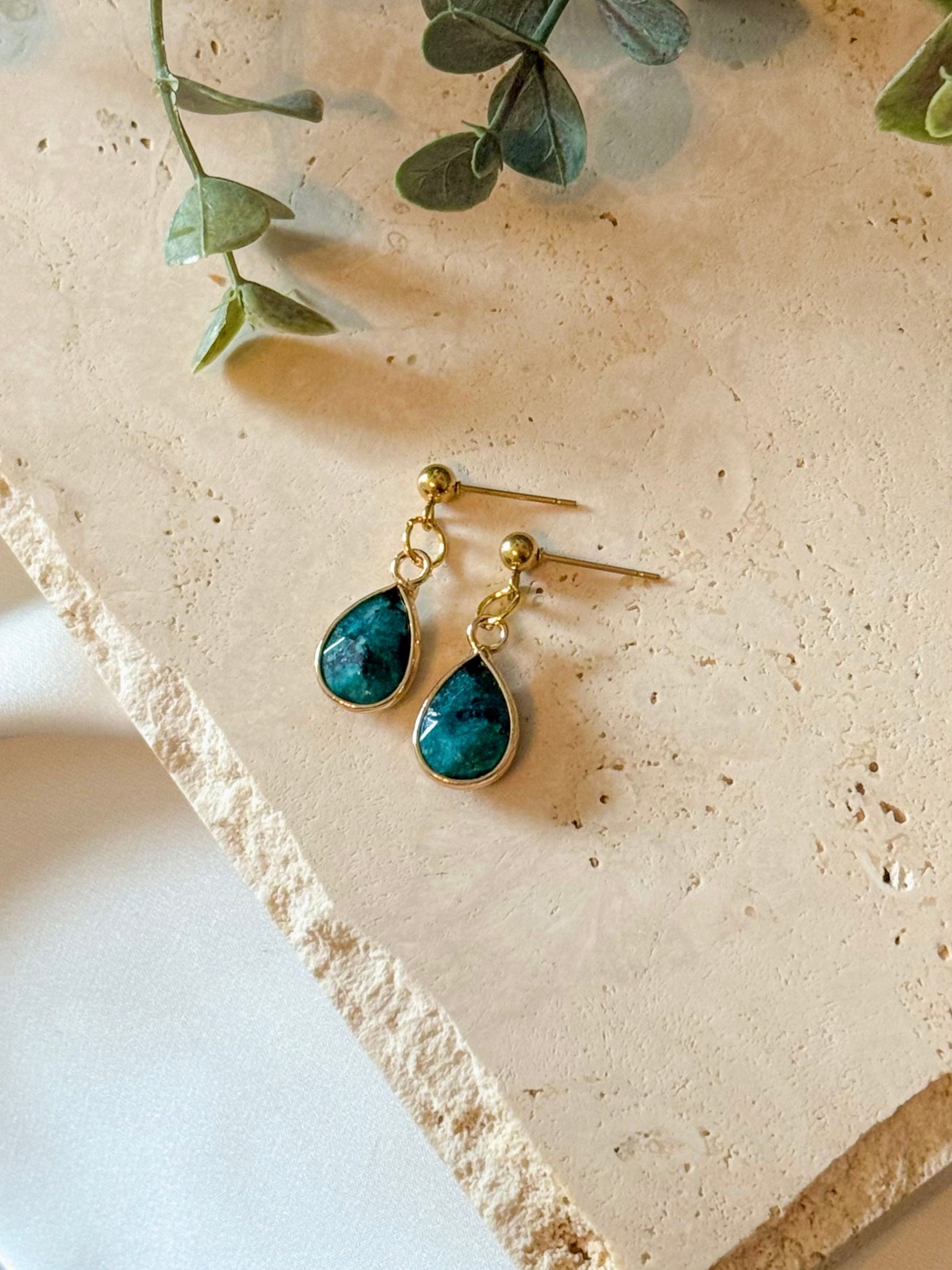 The Maya Earrings feature elegant teardrops of Blue Apatite, finished with 18k gold plating for a timeless, radiant glow.