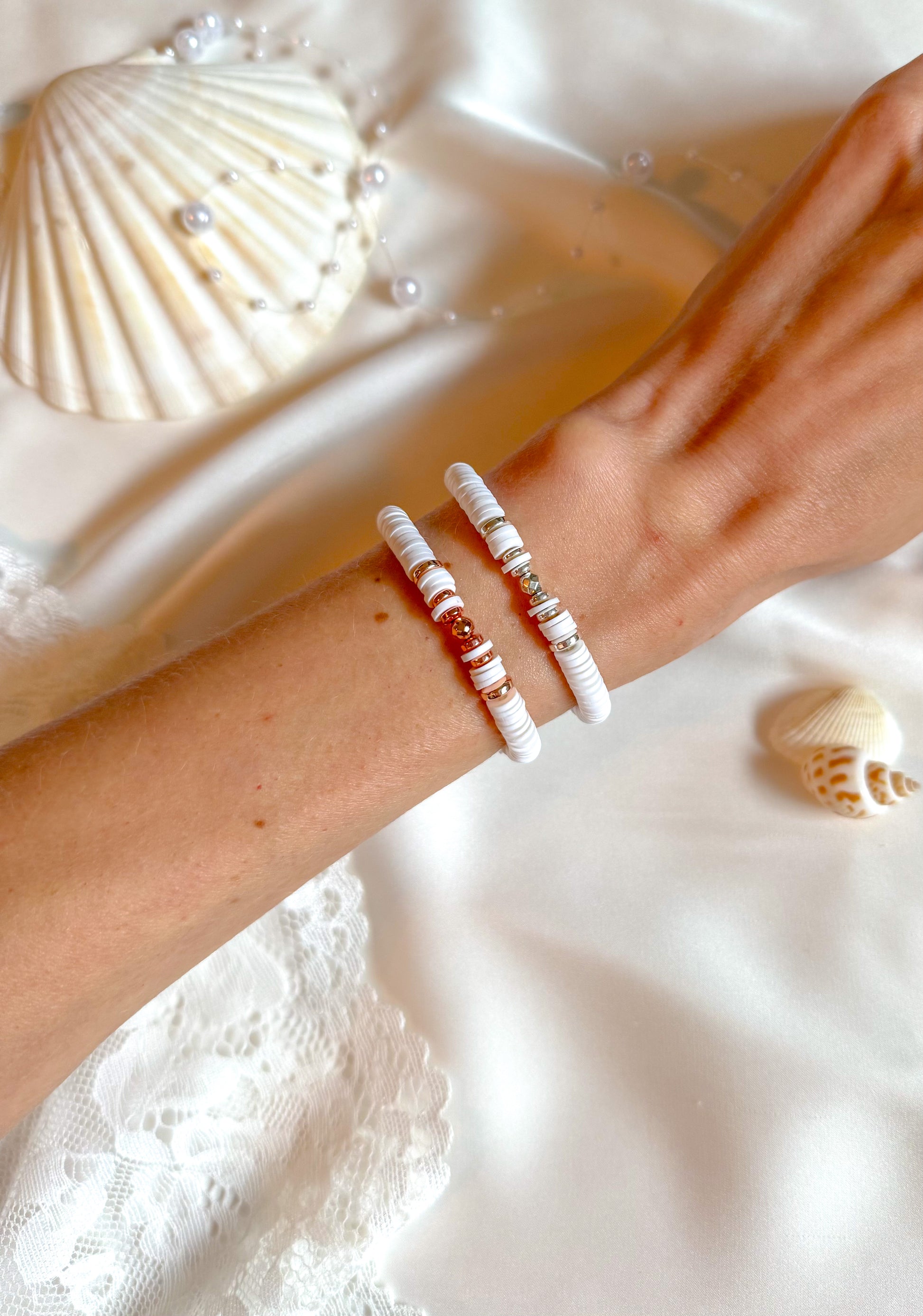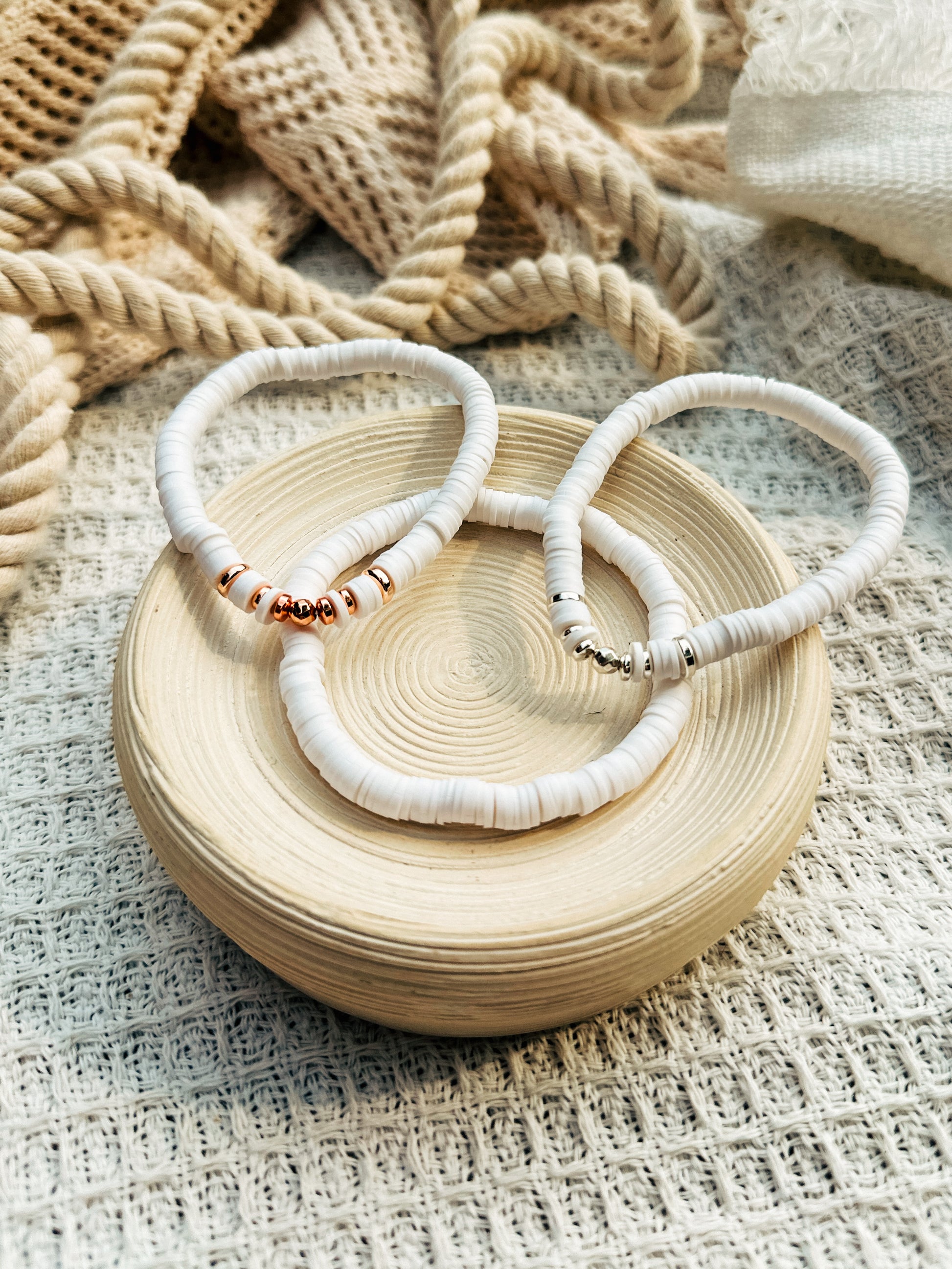 Introducing The Naya Bracelets, a beautiful collection crafted from white polymer clay heishi beads. These bracelets seamlessly blend style and wellness, making them an ideal accessory for any occasion.