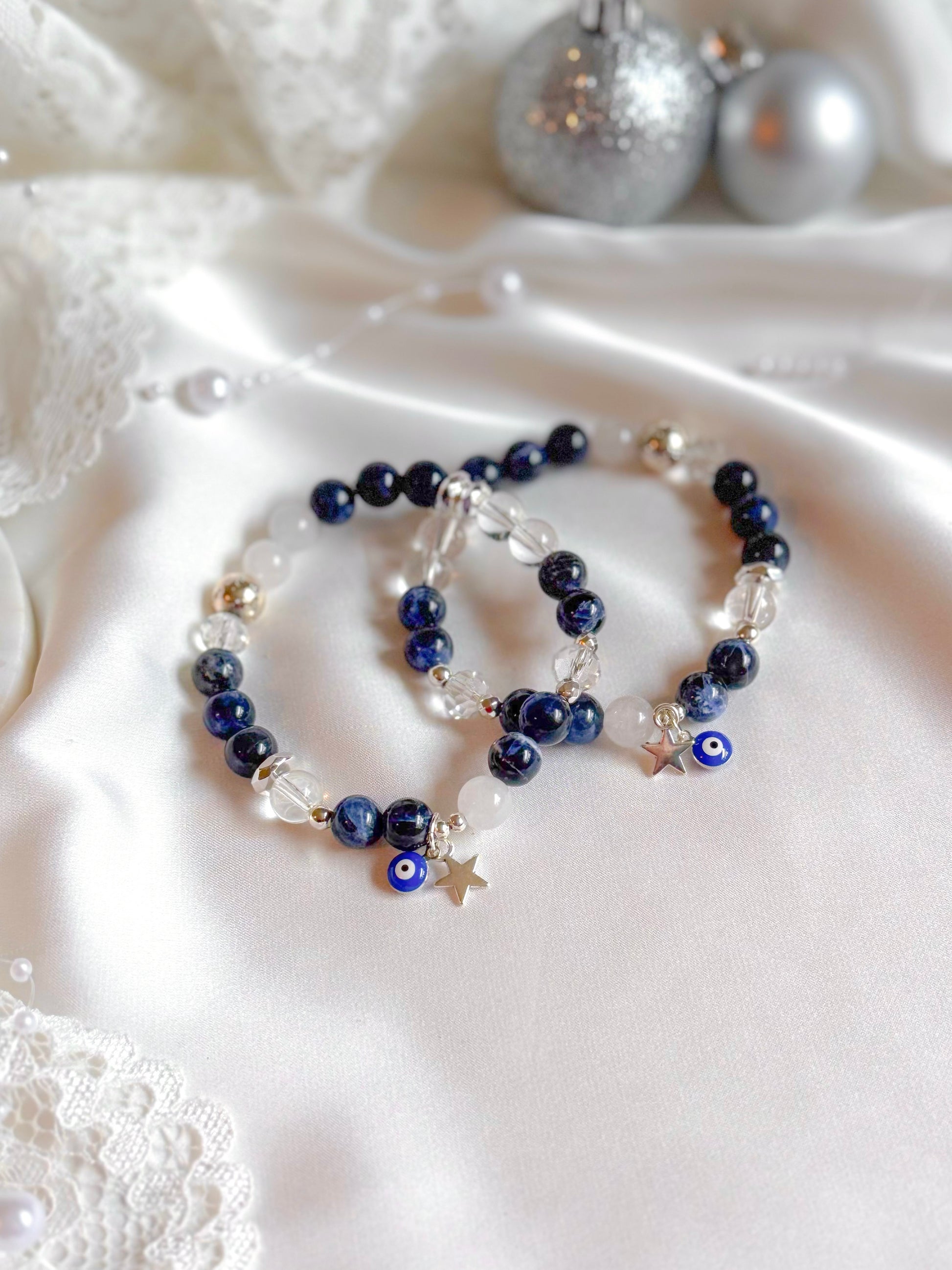 Charms – A silver star symbolizes hope and guidance, while the Evil Eye offers protection and good fortune.