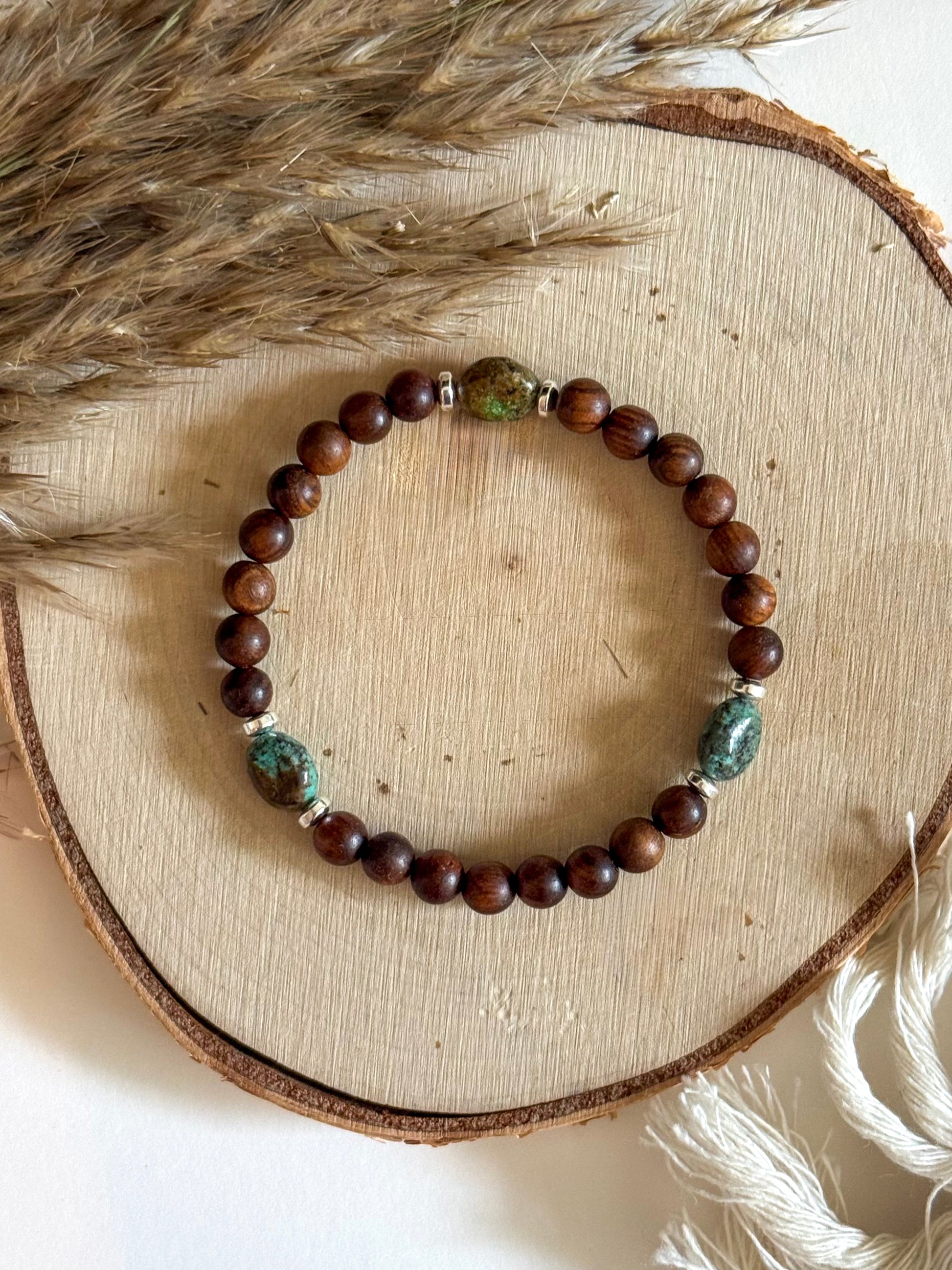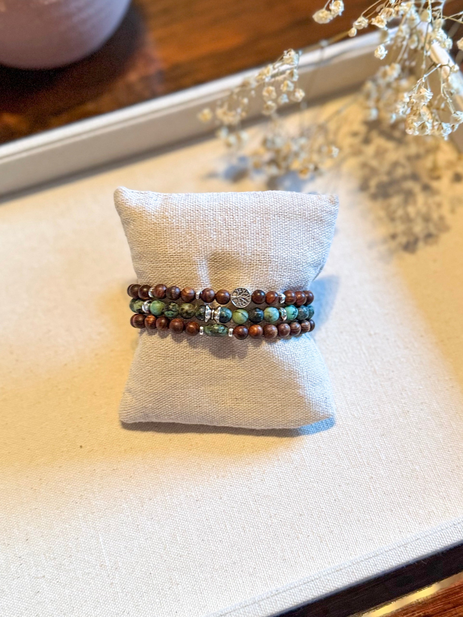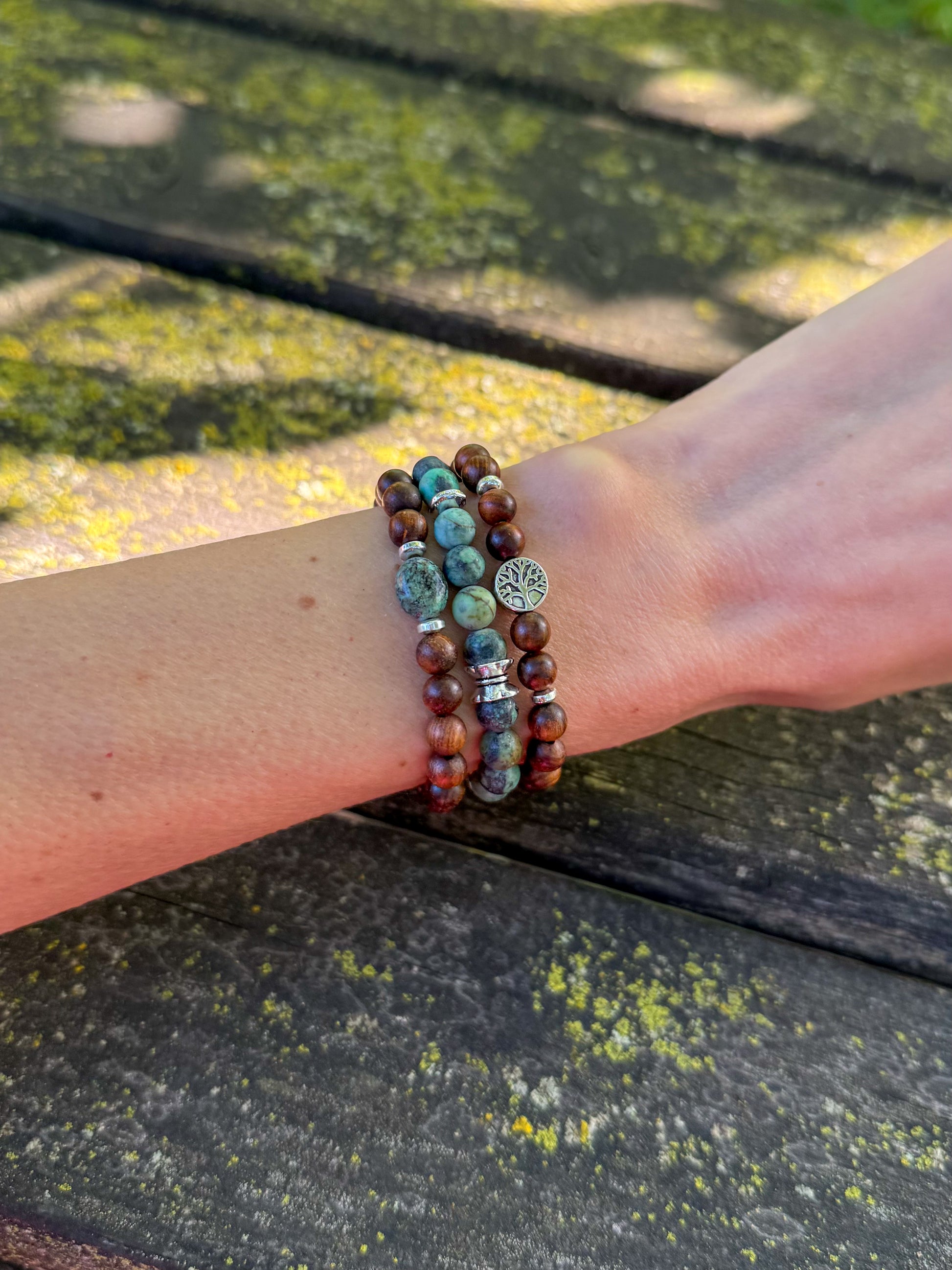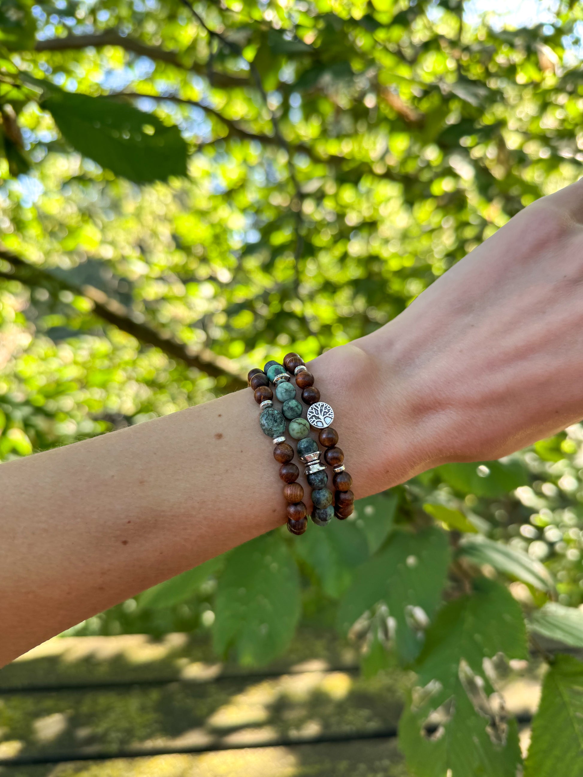 π A harmonious blend of Sandalwood and African Turquoise focal beads, finished with a Tree of Life accentβsymbolizing wisdom, strength, and interconnectedness.