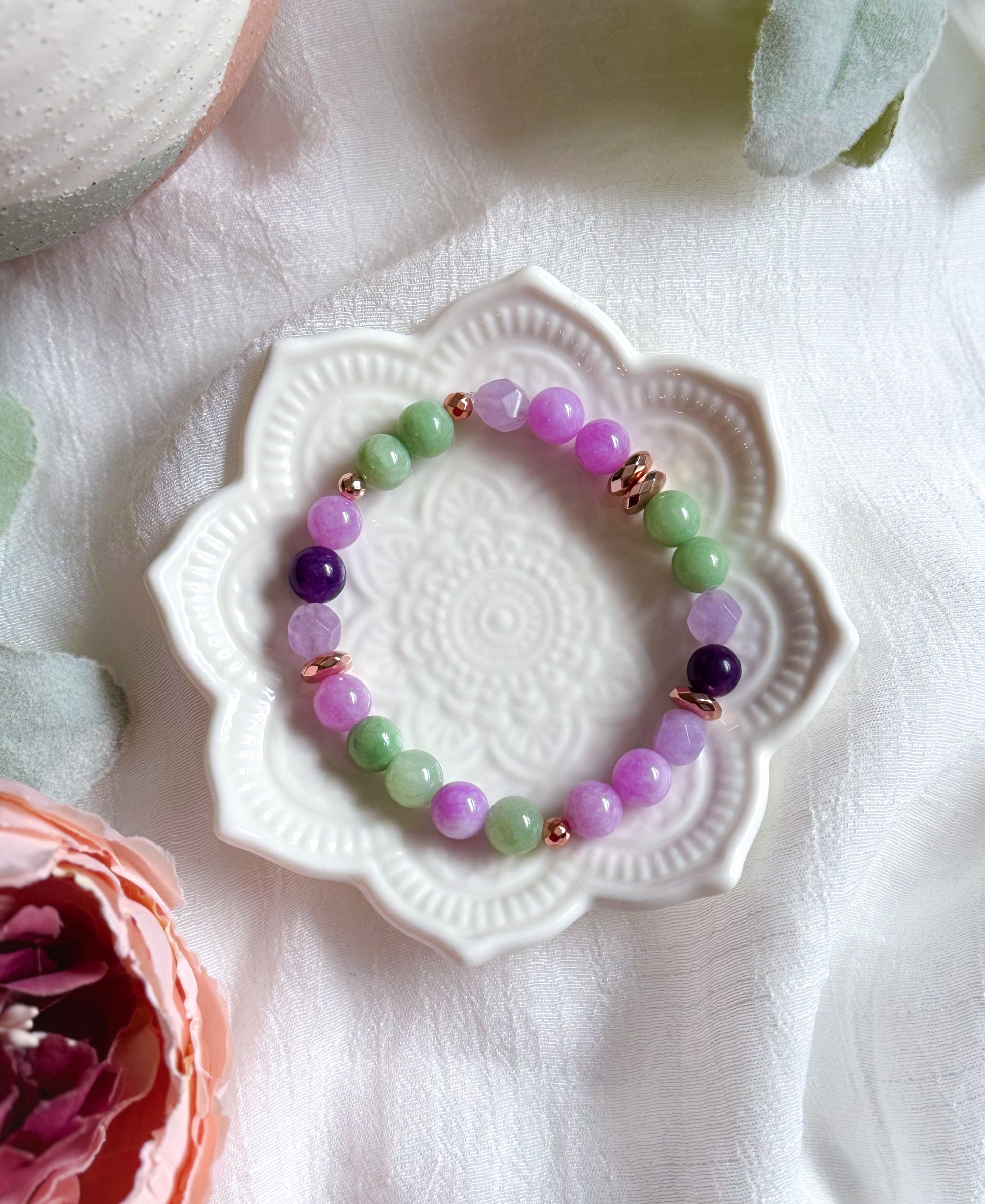 Inspired by cascading purple blossoms and soft green vines, this bracelet brings a touch of springtime magic wherever you go.